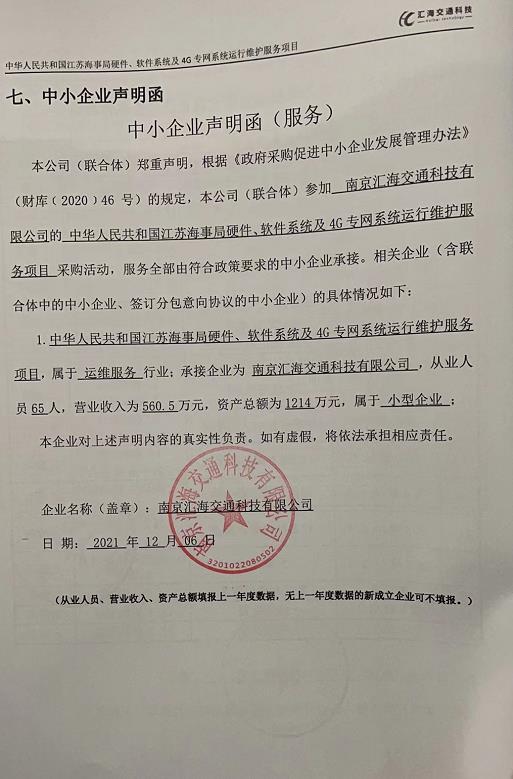 ----------------------------------招标机构发布信息原文:----------------------- 一、项目编号:0675-216JOC007658 二、项目名称:中华人民共和国江苏海事局硬件、软件系统及4G专网系统运行维护服务项目 三、中标信息 供应商名称:南京汇海交通科技有限公司 供应商地址:南京市玄武区中央路258-8号 中标金额:1020万元 四、主要标的信息 名称:硬件、软件系统及4G专网系统运行维护服务 服务范围:硬件、软件系统及4G专网系统运行维护服务 服务要求:满足采购人使用要求 服务时间:运维期限为2022年1月1日-2023年12月31日 服务标准:符合信息系统维保相关要求 五、评审专家名单:李哲、皮宗平、张庭富、曹婷、董丽珍、易康扬、于淼 六、代理服务收费标准及金额:定额收费55000元 七、公告期限 自本公告发布之日起1个工作日。 八、其他补充事宜 无 九、凡对本次公告内容提出询问,请按以下方式联系。 1.采购人信息名??? 称:中华人民共和国江苏海事局 地??? 址:江苏省南京市中央路238号 联系方式:夏先生 2.采购代理机构信息名??? 称:江苏海外集团国际工程咨询有限公司 地 ? 址:南京市建邺区云龙山路56号大唐科技大厦A座14层 联系方式:025-84795407 3.项目联系方式项目联系人:张斌 电 ???话:025-84795407 附件:中小企业申明.jpg 江苏海事局软硬件及4G专网维护招标文件发售稿20211117.pdf 十一、其他事项: ------------------------------------招标信息结束---------------------------- 标签: 中标 江苏 中华人民共和国 服务项目 运行维护 上一篇: 某部车辆维修采购项目(三次)中标公告1包 最新5000条招标信息列表: 滚动招标 |