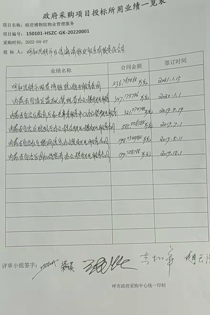 赵卫民、梁丽英、李树军、张跃、赵云波(采购人代表) 六、代理服务收费标准及金额:代理服务费收费标准: 无 代理服务费金额: 合同包1(昭君博物院物业管理服务): 0万元。收取对象:无。 七、公告期限自本公告发布之日起1个工作日。 八、其他补充事宜无 九、凡对本次公告内容提出询问,请按以下方式联系。 1.采购人信息名称:呼和浩特市文物保护与考古研究中心 地址:蒙西广场 联系方式:13015220031 2.采购代理机构信息名称:呼和浩特市政府采购中心 地址:内蒙古自治区呼和浩特市新城区呼和浩特市丁香路2号 联系方式:0471-5988129 3.项目联系方式项目联系人:刘女士 电话:0471-5988129 呼和浩特市政府采购中心 2022年04月07日 相关附件: 昭君博物院物业管理服务报价明细附件.pdf 业绩.jpg 十一、其他事项: ------------------------------------招标信息结束---------------------------- 标签: 昭君 呼和浩特市 博物院 研究中心 物业管理服务 公告 上一篇: 市容两违巡查辅助服务结果公告(包1) 最新5000条招标信息列表: 滚动招标 |