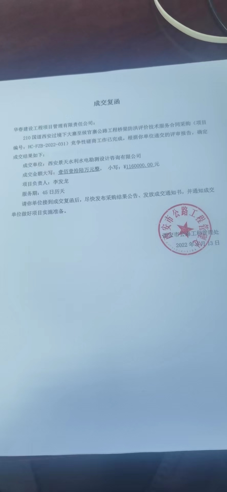 自本公告发布之日起1个工作日。 八、其他补充事宜无 九、凡对本次公告内容提出询问,请按以下方式联系。 1.采购人信息名称:西安市公路工程管理处 地址:西安市含光南路218号交通信息大厦9楼 联系方式:029-88215565 2.采购代理机构信息名称:华春建设工程项目管理有限责任公司 地址:西安市南二环成长大厦8楼 联系方式:18220586889 3.项目联系方式项目联系人:支工 电话:18220586889 华春建设工程项目管理有限责任公司 2022年04月14日 相关附件: 西安市公路工程管理处210国道西安过境下大寨至候官寨公路工程桥梁防洪评价技术服务合同中标(成交)明细.pdf 成交复函.jpg 十一、其他事项: ------------------------------------招标信息结束---------------------------- 标签: 中标 西安 公路工程 西安市 大寨 管理处 国道 上一篇: 国家海洋局秦皇岛海洋环境监测中心站2022年度秦皇岛中心站生态预警监测浮标事故修复和系统升级服务项目中标公告 最新5000条招标信息列表: 滚动招标 |