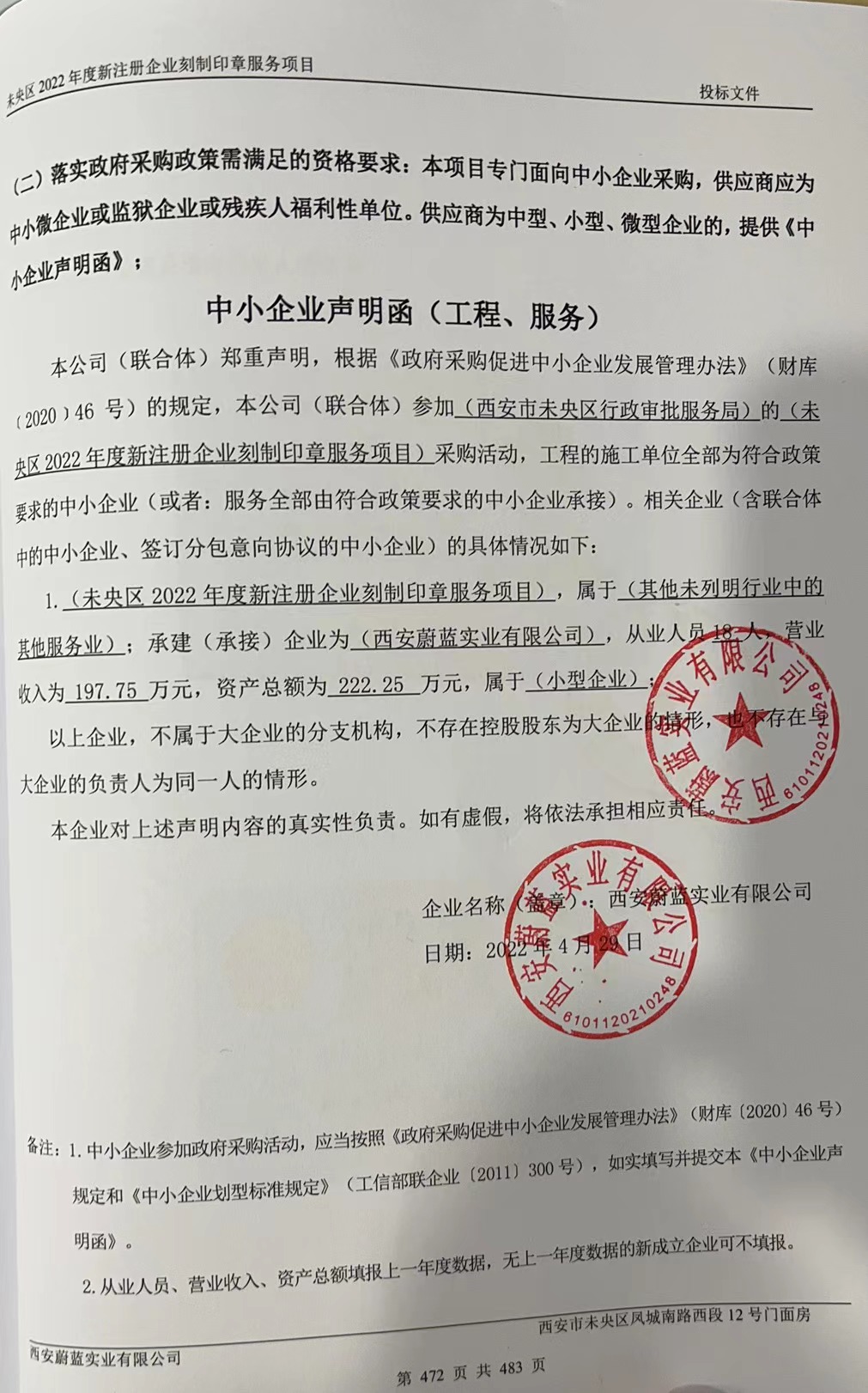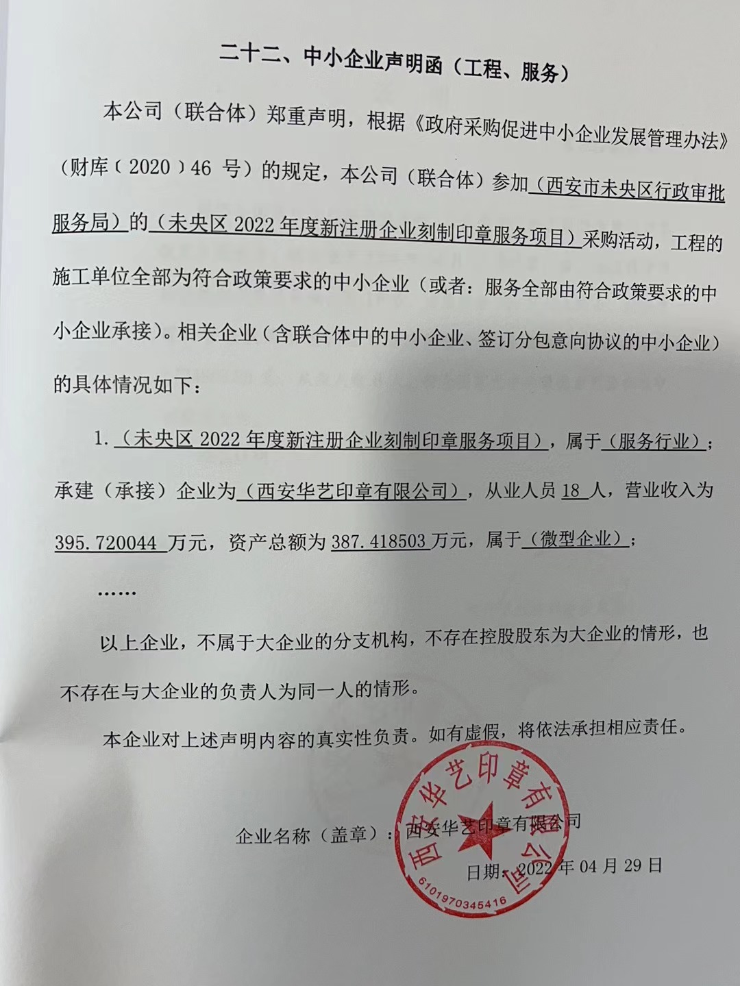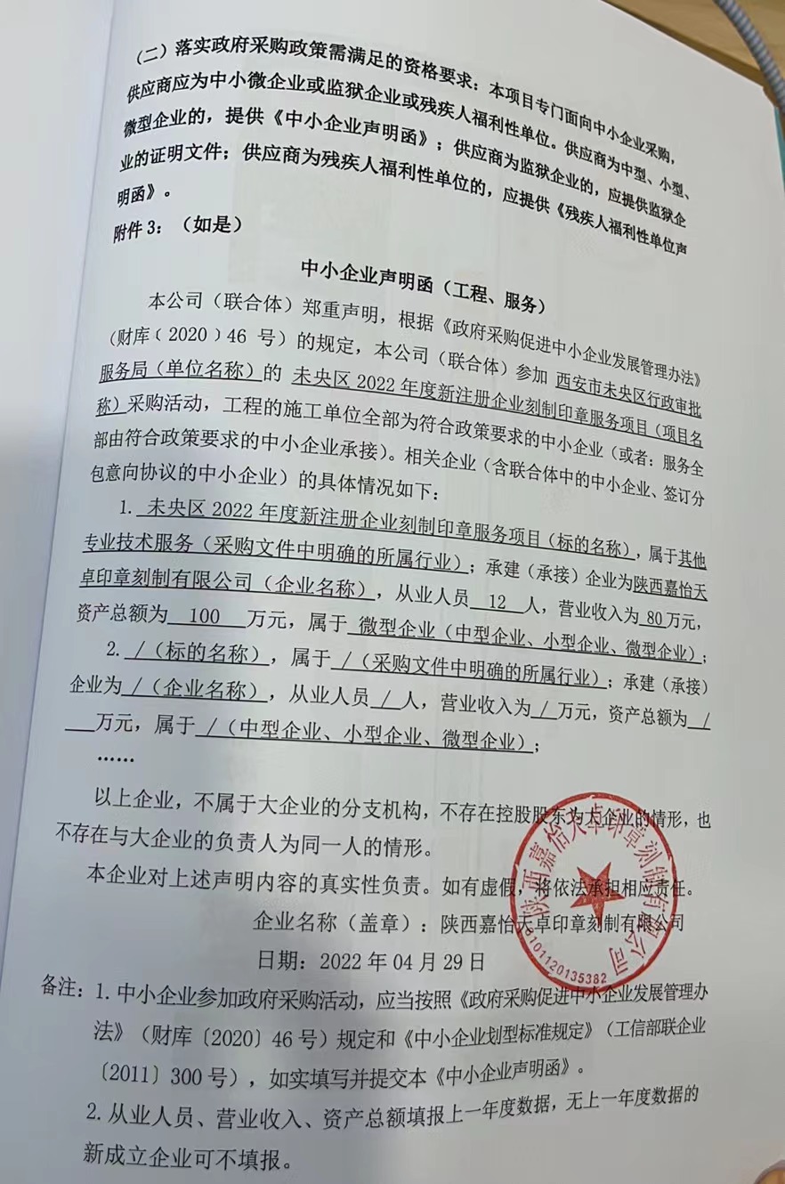 自本公告发布之日起1个工作日。 八、其他补充事宜无 九、凡对本次公告内容提出询问,请按以下方式联系。 1.采购人信息名称:西安市未央区行政审批服务局 地址:西安市未央区未央路80号盛龙广场五楼未央区政务服务中心 联系方式:029-89579106 2.采购代理机构信息名称:陕西齐海宇工程项目管理有限公司 地址:西安市未央区白桦林国际B座1603室 联系方式:029-89151632 3.项目联系方式项目联系人:周涛、郭荣娟 电话:029-89151632 陕西齐海宇工程项目管理有限公司 2022年04月29日 相关附件: 西安市未央区行政审批服务局未央区2022年度新注册企业刻制印章服务项目中标(成交)明细.pdf 西安蔚蓝实业有限公司中小微声明 (2).jpg 西安蔚蓝实业有限公司一览表.jpg 陕西嘉怡天卓印章刻制有限公司一览表.jpg 陕西嘉怡天卓印章刻制有限公司中小微声明.jpg 西安华艺印章有限公司一览表.jpg 西安华艺印章有限公司中小微声明.jpg 十一、其他事项: ------------------------------------招标信息结束---------------------------- 标签: 中标 印章 服务项目 年度 刻制 公告 企业 上一篇: 江西华灏工程造价咨询有限公司关于中共南丰县委员会组织部南丰县桔都智慧党建系统升级建设项目(招标编号:JXHH-NF-2022-J003)竞争性谈判采购结果公示 最新5000条招标信息列表: 滚动招标 |