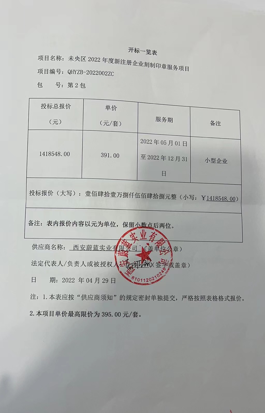 合同包1(未央区2022年度新注册企业刻制印章服务项目): 服务类(西安蔚蓝实业有限公司)