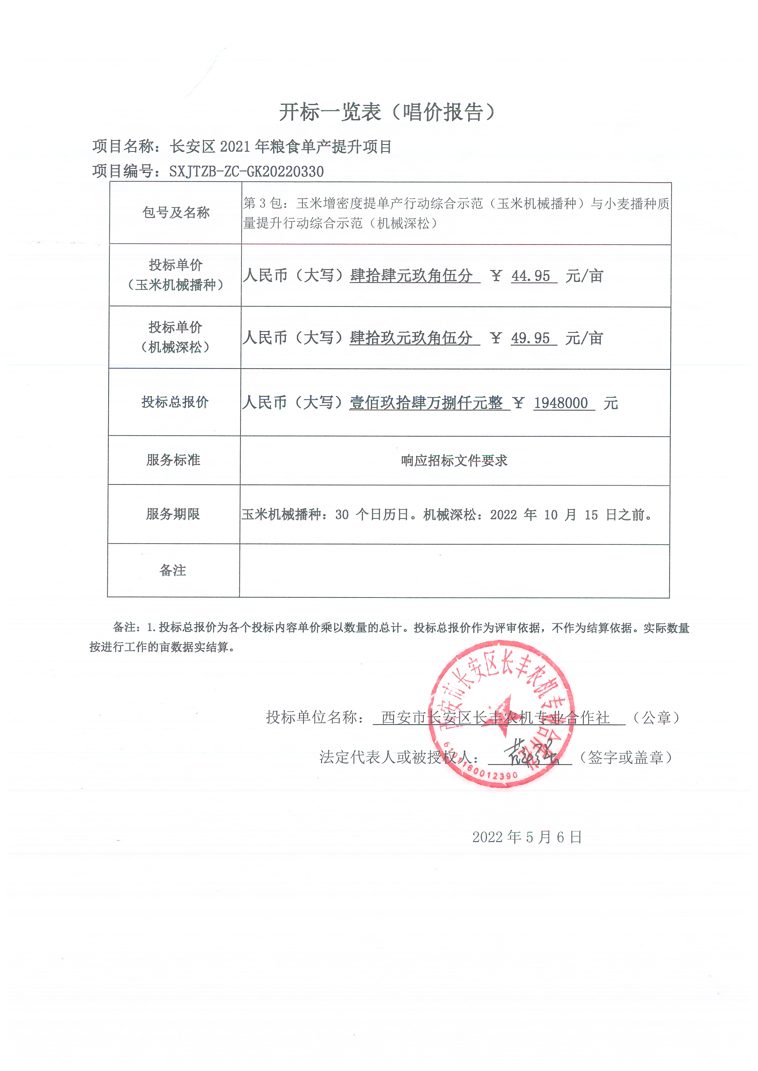 自本公告发布之日起1个工作日。 八、其他补充事宜第1包:中标单位:陕西长丰种业有限公司,中标单价:正大12:49.80元、秦龙14:49.80元、泛玉5号:49.80元、泛玉298:49.80元、长丰405:49.80元;第2包:中标单位:陕西隆丰种业有限公司,中标单价:正大12:49.90元、秦龙14:49.90元、泛玉5号:49.90元、泛玉298:49.90元、长丰405:49.90元;第3包:西安市长安区长丰农机专业合作社,中标单价:玉米机械播种:44.95元/亩、机械深松:49.95元/亩。最终结算根据中标单位的中标单价据实结算。 九、凡对本次公告内容提出询问,请按以下方式联系。 1.采购人信息名称:西安市长安区农业技术推广中心 地址:西安市长安区南长安街201A 联系方式:029-85622271 2.采购代理机构信息名称:陕西嘉唐建设项目管理有限公司 地址:西安市未央区凤城五路与明光路十字天朗经开中心10楼11002室 联系方式:029-89351397 3.项目联系方式项目联系人:李莹 电话:029-89351397 陕西嘉唐建设项目管理有限公司 2022年05月07日 相关附件: 西安市长安区农业技术推广中心长安区2021年粮食单产提升项目中标(成交)明细.pdf 2包报价单.pdf 3包报价表.jpg 1包报价单.pdf 三包中小企业声明函.pdf 一包中小企业声明函.pdf 招标文件-长安区2021年粮食单产提升项目(第1、2包).docx 招标文件-长安区2021年粮食单产提升项目(第3包).docx 十一、其他事项: ------------------------------------招标信息结束---------------------------- 标签: 项目 中标 长安 单产 粮食 公告 上一篇: 延安市安塞区乡村振兴局关于2022年财政衔接推进乡村振兴补助资金产业化项目(沿河湾镇沿河湾村花渠大棚生产路工程)中标(成交)结果公告 最新5000条招标信息列表: 滚动招标 |