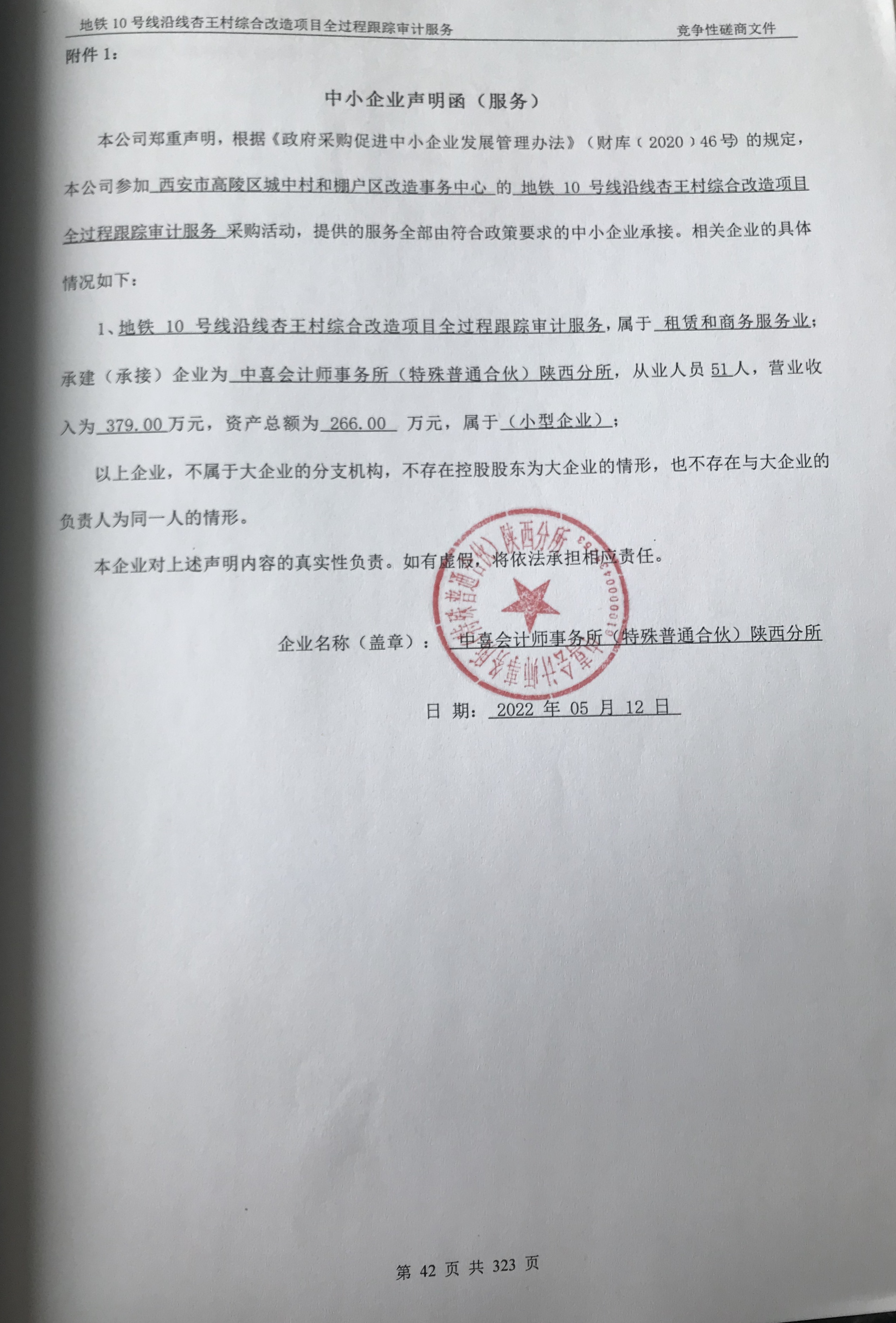 合同包1(地铁10号线沿线杏王村综合改造项目全过程跟踪宙计服务): 服务类(中喜会计师事务所(特殊普通合伙)陕西分所)