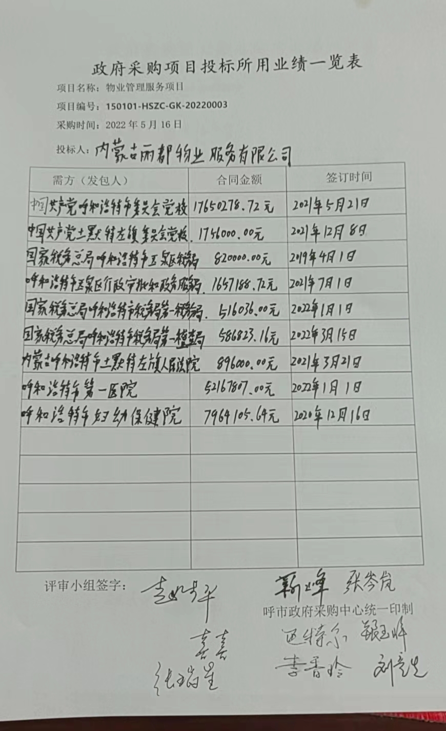 巴特尔(采购人代表)、银玉峰、张岑岚(采购人代表)、赵生平、张瑞星、刘竟先、靳峰(采购人代表)、喜喜、李香玲 六、代理服务收费标准及金额:代理服务费收费标准: 无 代理服务费金额: 合同包1(物业管理服务项目): 0万元。收取对象:无。 七、公告期限自本公告发布之日起1个工作日。 八、其他补充事宜无 九、凡对本次公告内容提出询问,请按以下方式联系。 1.采购人信息名称:中国共产党呼和浩特市委员会党校 地址:呼和浩特市和林格尔新区云鹏西街1号市委党校 联系方式:7251055 2.采购代理机构信息名称:呼和浩特市政府采购中心 地址:内蒙古自治区呼和浩特市新城区呼和浩特市丁香路2号 联系方式:0471-5988129 3.项目联系方式项目联系人:刘女士 电话:0471-5988129 呼和浩特市政府采购中心 2022年05月16日 相关附件: 物业管理服务项目报价明细附件.pdf 业绩.jpg 十一、其他事项: ------------------------------------招标信息结束---------------------------- 标签: 呼和浩特市 中国共产党 党校 服务项目 物业管理 委员会 公告 上一篇: 江西银隆管理咨询有限公司关于南昌县卫生健康委员会突发重大公共卫生事件(含新冠肺炎疫情防控)采购项目(采购编号:JXYL2022-J0501)成交公告 最新5000条招标信息列表: 滚动招标 |