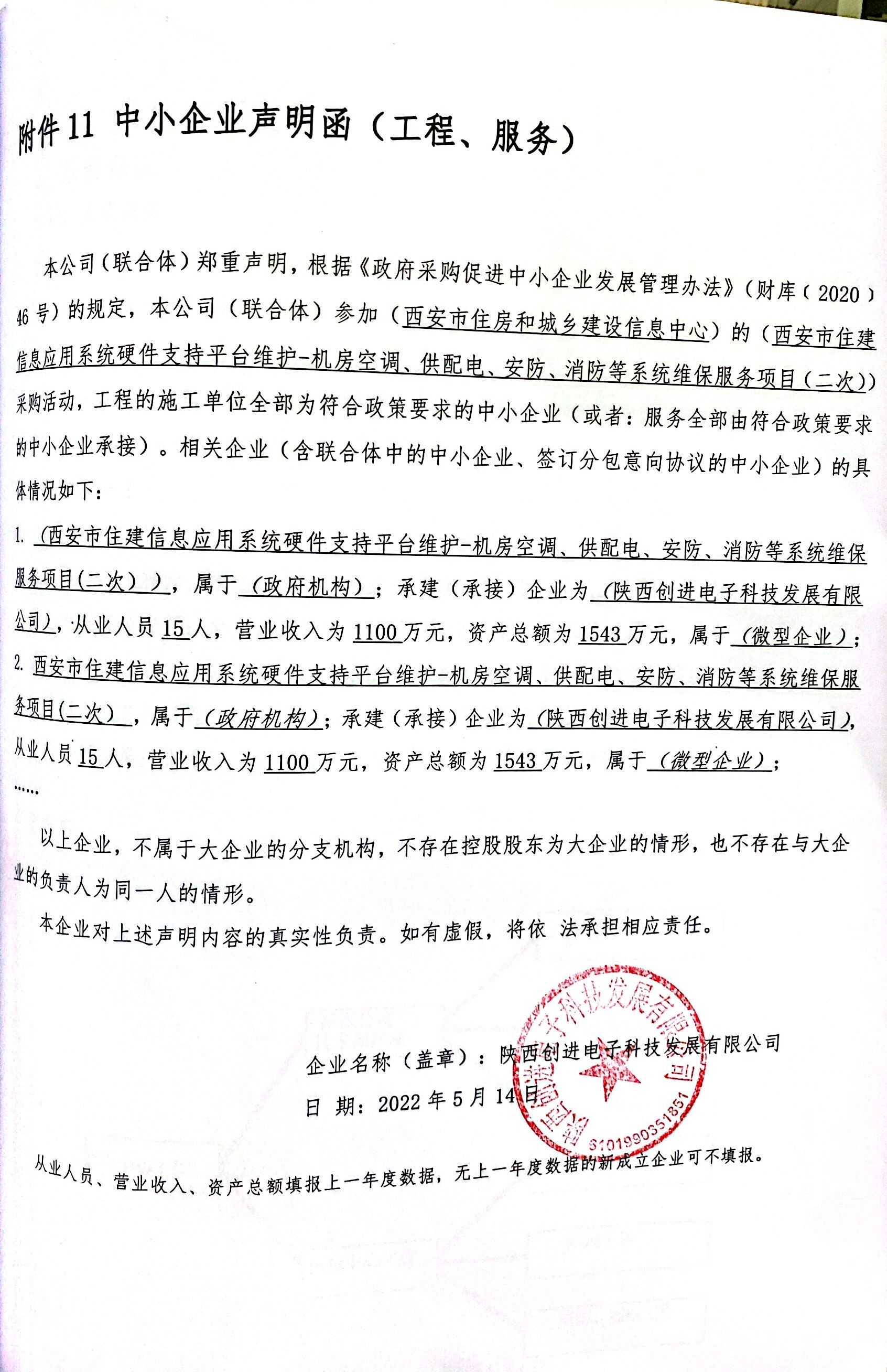 自本公告发布之日起1个工作日。 八、其他补充事宜/ 九、凡对本次公告内容提出询问,请按以下方式联系。 1.采购人信息名称:西安市住房和城乡建设信息中心 地址:西大街116号 联系方式:13669226037 2.采购代理机构信息名称:陕西中技招标有限公司 地址:西安市高新区高新四路1号高科广场A座1001室 联系方式:029-88364979 3.项目联系方式项目联系人:杨艳、李毓菲、沈肖楠 电话:029-88364979-821/872 陕西中技招标有限公司 2022年05月24日 相关附件: 西安市住房和城乡建设信息中心西安市住建信息应用系统硬件支持平台维护-机房空调、供配电、安防、消防等系统维保服务项目(二次)中标(成交)明细.pdf 中小企业声明函.jpg 报价.jpg 最终版(二次)西安市住建信息应用系统硬件支持平台维护-机房空调、供配电、安防、消防等系统维保服务项目.pdf 十一、其他事项: ------------------------------------招标信息结束---------------------------- 标签: 中标 西安市 系统 安防 机房 服务项目 空调 上一篇: 惠州检测院2022年度检验检测仪器采购项目(二次)结果公告 最新5000条招标信息列表: 滚动招标 |