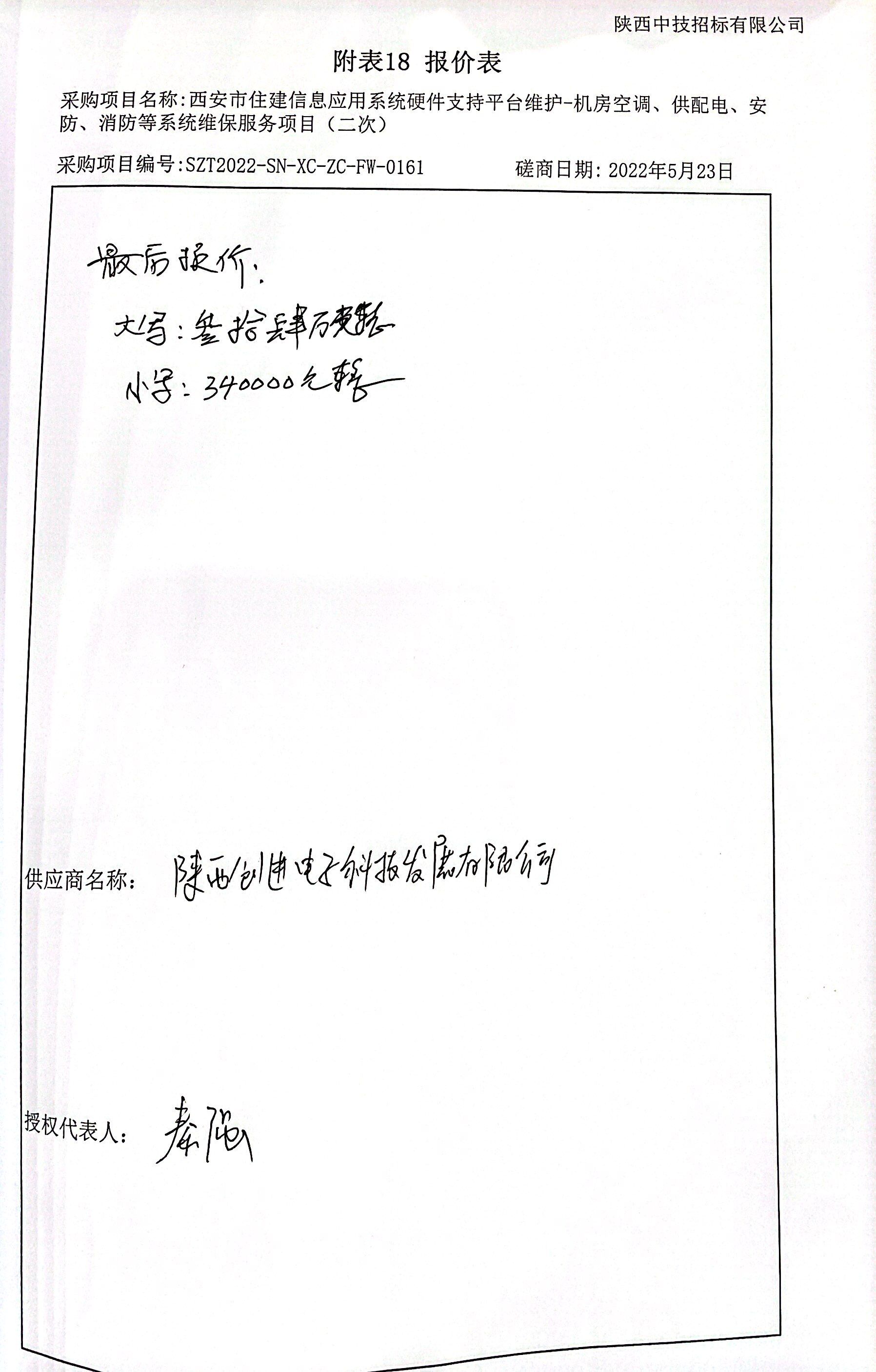 ----------------------------------招标机构发布信息原文:----------------------- <meta http-equiv="content-type" content="text/html;charset=utf-8"> 一、项目编号:SZT2022-SN-XC-ZC-FW-0161. 二、项目名称:西安市住建信息应用系统硬件支持平台维护-机房空调、供配电、安防、消防等系统维保服务项目(二次) 三、采购结果 合同包1(西安市住建信息应用系统硬件支持平台维护-机房空调、供配电、安防、消防等系统维保服务项目):
