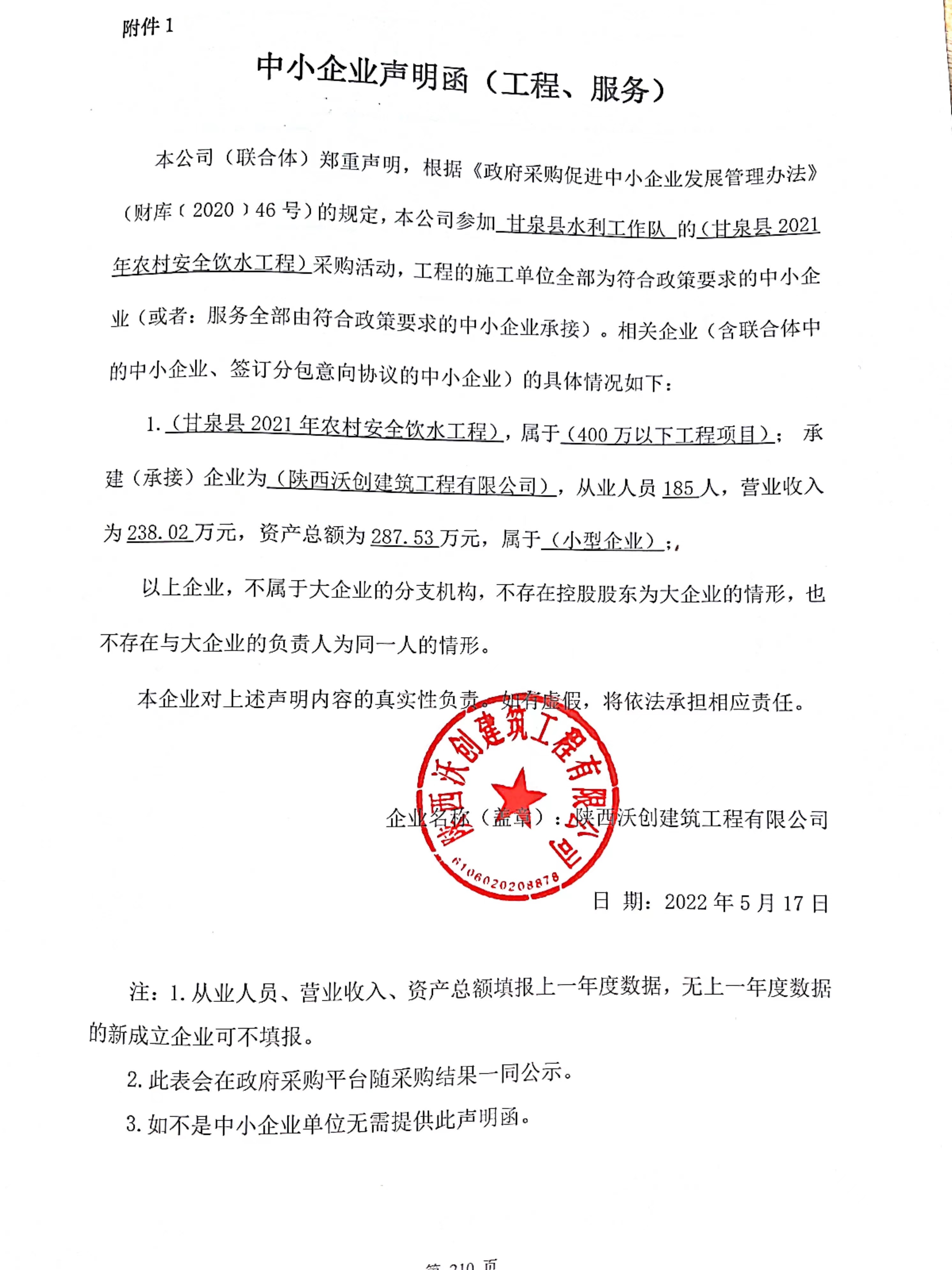 合同包1(甘泉县水利工作队2021年农村安全饮水工程): 工程类(陕西沃创建筑工程有限公司)