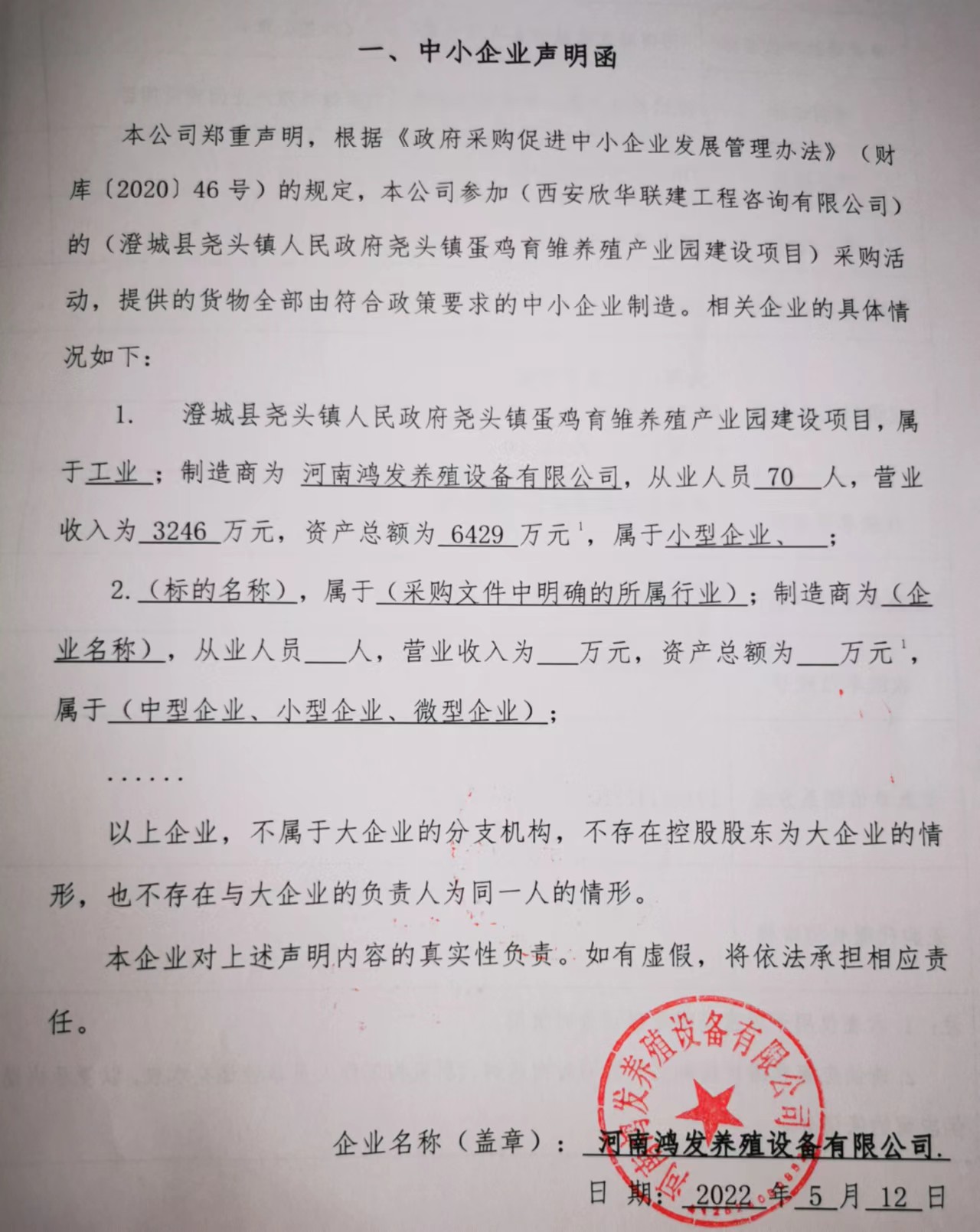 合同包1(澄城县尧头镇人民政府尧头镇蛋鸡育雏养殖产业园建设项目): 货物类(河南鸿发养殖设备有限公司)