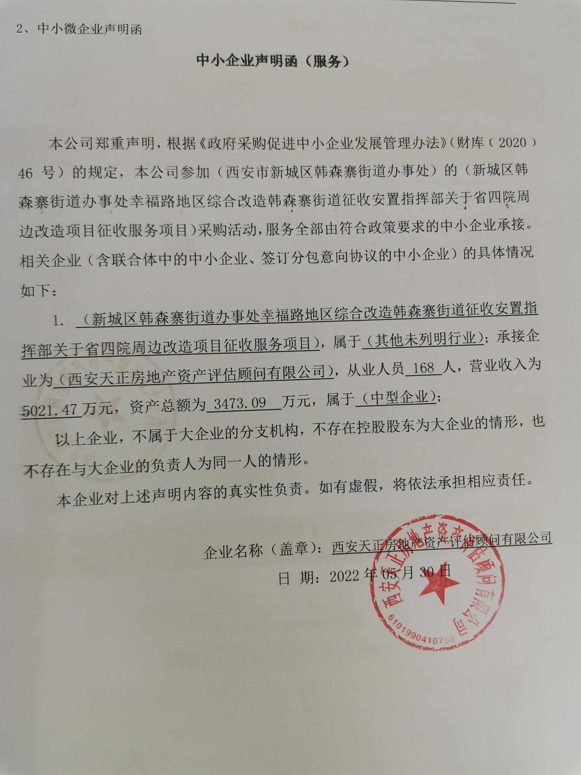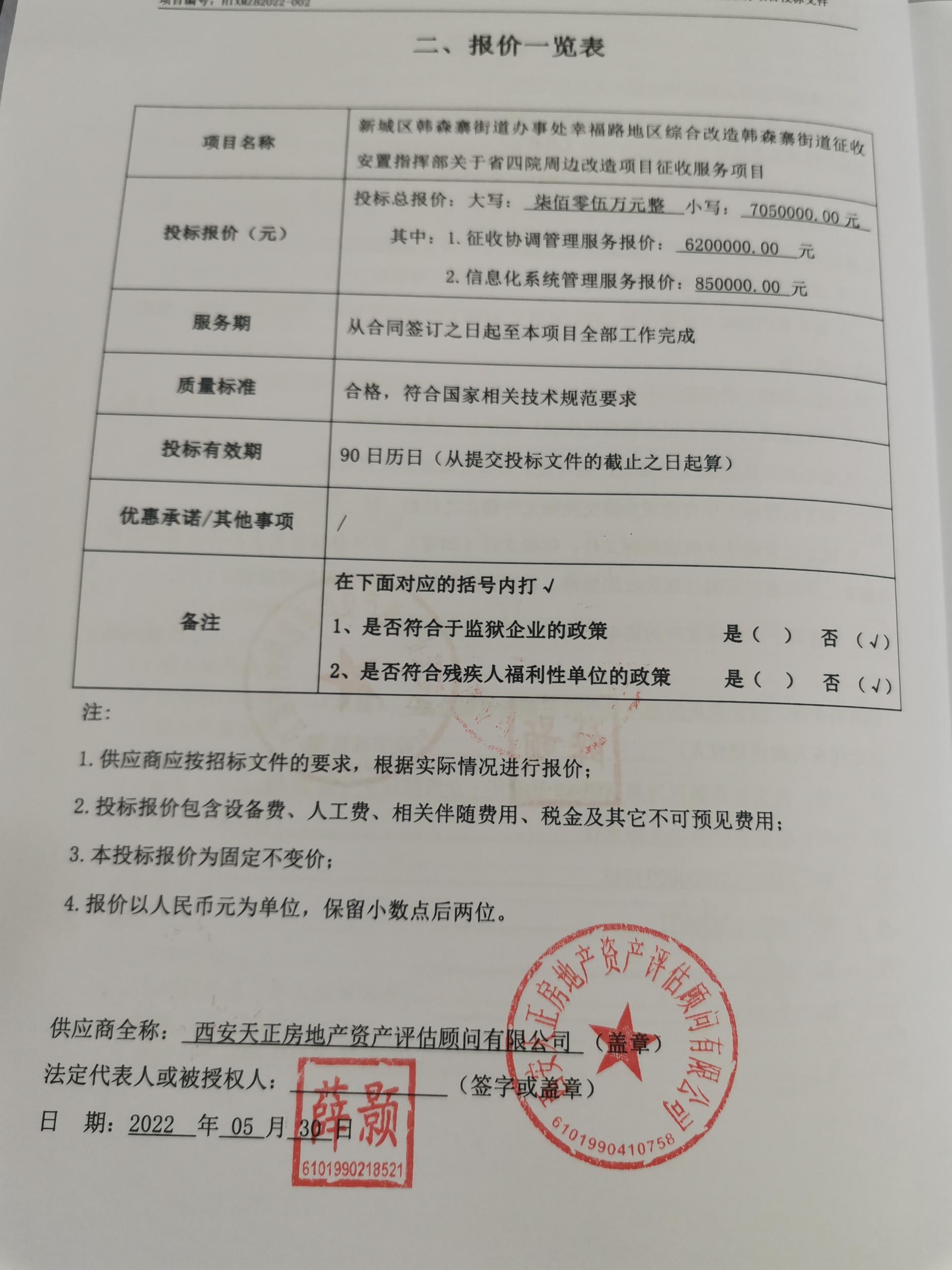 自本公告发布之日起1个工作日。 八、其他补充事宜无 九、凡对本次公告内容提出询问,请按以下方式联系。 1.采购人信息名称:西安市新城区韩森寨街道办事处 地址:西安市新城区咸宁东路611号 联系方式:029-83219500 2.采购代理机构信息名称:陕西华泰工程项目管理有限公司 地址:陕西省西安市经开区凤城五路世融嘉轩5号楼27层 联系方式:029-86250354 3.项目联系方式项目联系人:杨工、纪工 电话:029-86250354 陕西华泰工程项目管理有限公司 2022年06月01日 相关附件: 西安市新城区韩森寨街道办事处新城区韩森寨街道办事处幸福路地区综合改造韩森寨街道征收安置指挥部关于省四院周边改造项目征收服务项目中标(成交)明细.pdf 中小企业声明.jpg 报价明细.jpg 十一、其他事项: ------------------------------------招标信息结束---------------------------- 标签: 中标 指挥部 街道办事处 服务项目 改造项目 街道 城区 上一篇: 2022年统筹整合财政涉农资金农村基础设施建设第二批项目(涧岗乡)评标结果公示 最新5000条招标信息列表: 滚动招标 |