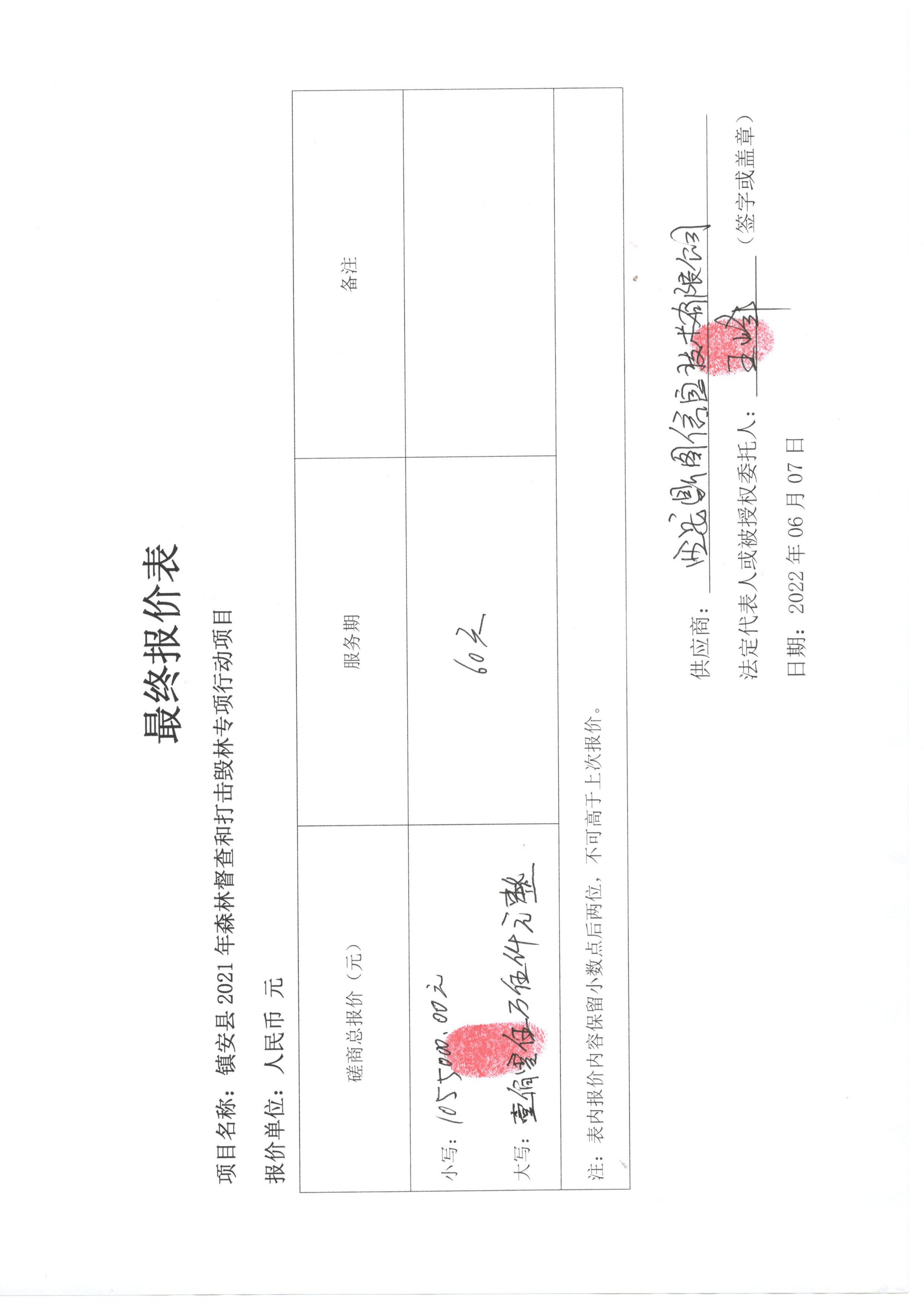 自本公告发布之日起1个工作日。 八、其他补充事宜/ 九、凡对本次公告内容提出询问,请按以下方式联系。 1.采购人信息名称:镇安县林业局(本级) 地址:陕西省商洛市镇安县后街64号 联系方式:0194-5326172 2.采购代理机构信息名称:陕西中辉项目管理有限公司 地址:陕西省商洛市商州区商郡城4号楼1单元601室 联系方式:0914-2317369 3.项目联系方式项目联系人:杨弘熙 电话:0914-2317369 陕西中辉项目管理有限公司 2022年06月10日 相关附件: 镇安县林业局(本级)镇安县2021年森林督查和打击毁林专项行动项目中标(成交)明细.pdf 二次报价表.jpg 定稿-镇安县2021年森林督查和打击毁林专项行动项目竞争性磋商文件(2).doc 十一、其他事项: ------------------------------------招标信息结束---------------------------- 标签: 中标 项目 镇安县 林业局 督查 专项 森林 上一篇: 献县候张撤退路祝庄至前小平王段翻建工程竞争性磋商中标公告 最新5000条招标信息列表: 滚动招标 |