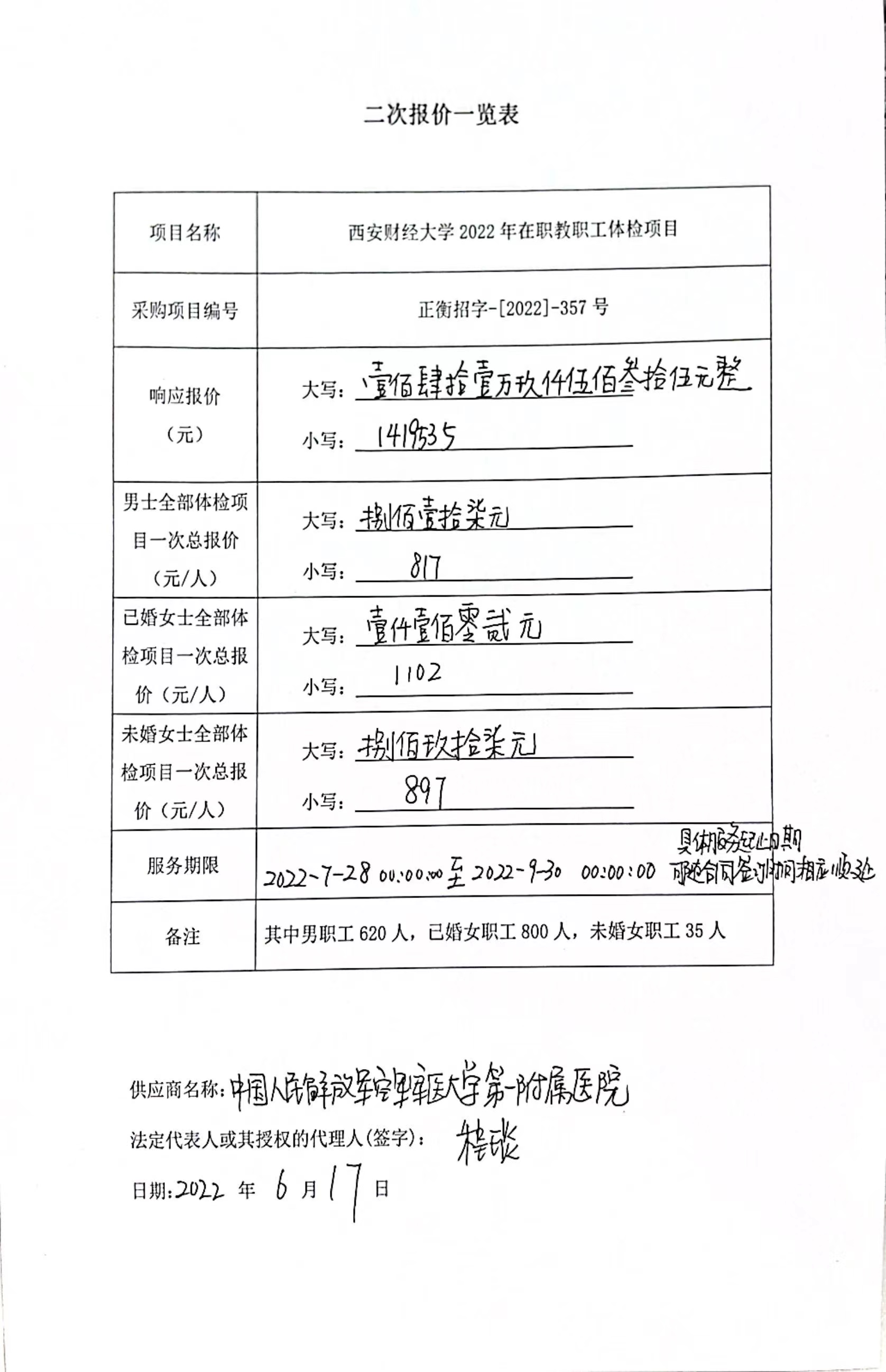 合同包1(西安财经大学2022年在职教职工体检项目): 服务类(中国人民解放军空军军医大学第一附属医院)