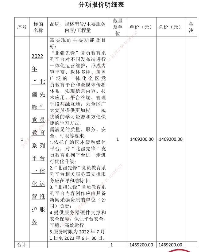 ----------------------------------招标机构发布信息原文:----------------------- <meta http-equiv="content-type" content="text/html;charset=utf-8"> 一、项目编号:NMGZC-D-F-220192 二、项目名称:2022年“北疆先锋”党员教育系列平台一体化运营维护服务 三、采购结果 合同包1(北疆先锋平台运营维护):
