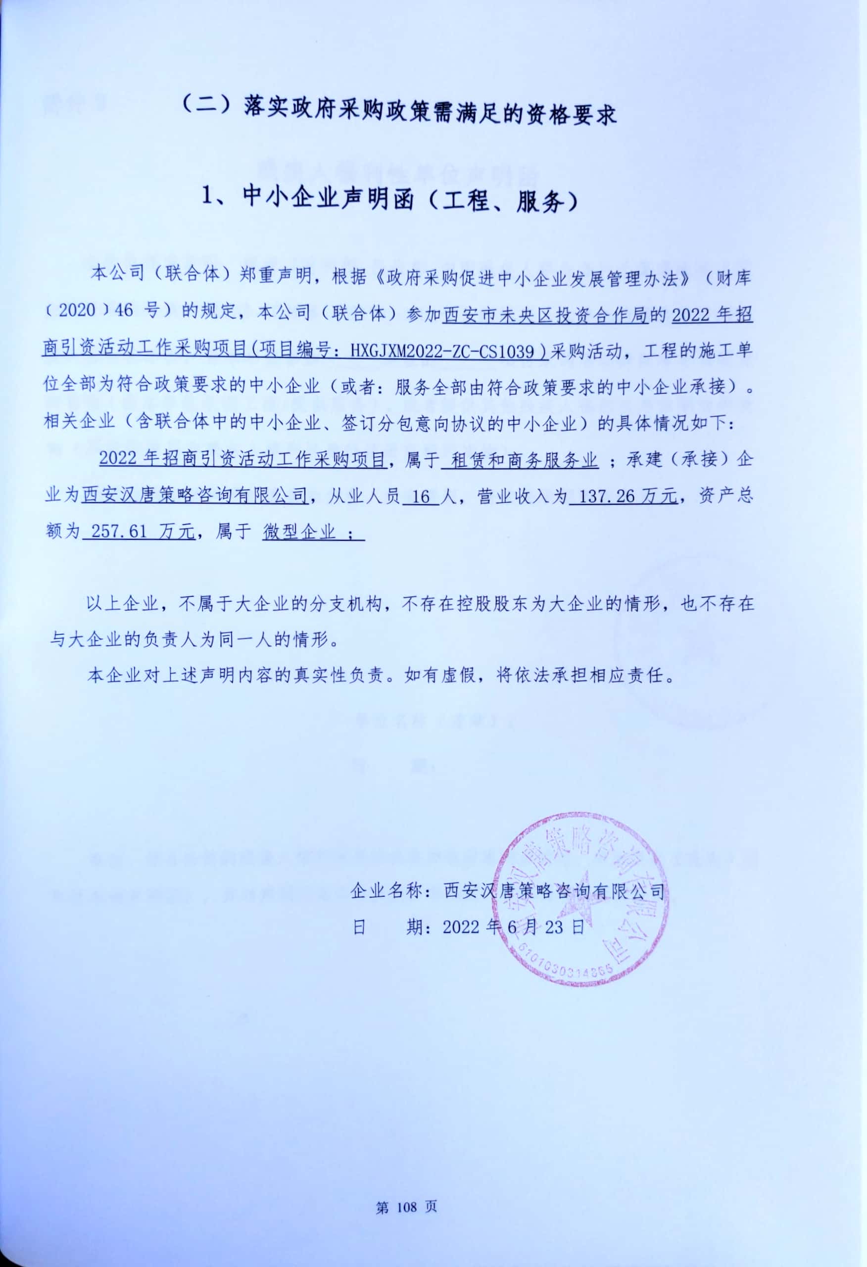 自本公告发布之日起1个工作日。 八、其他补充事宜无 九、凡对本次公告内容提出询问,请按以下方式联系。 1.采购人信息名称:西安市未央区投资合作局 地址:西安市未央路未央大厦8楼 联系方式:86259749 2.采购代理机构信息名称:华夏国际项目管理有限公司 地址:陕西省西安市雁塔区西安市高新区沣惠南路34号1幢1单元11101室 联系方式:029-88899970/72/73/75-825 3.项目联系方式项目联系人:罗盟、张艳萍、李莹 电话:029-88899970/72/73/75-825 华夏国际项目管理有限公司 2022年06月24日 相关附件: 西安市未央区投资合作局2022年招商引资工作采购项目中标(成交)明细.pdf 二次报价.jpg 中小企业声明函.jpg 西安市未央区2022年招商引资工作采购项目磋商文件(定稿).doc 十一、其他事项: ------------------------------------招标信息结束---------------------------- 标签: 项目 采购 合作 中标 西安市 招商引资工作 公告 上一篇: 2022年6月24日板房子管护站房改造项目中标(成交)结果公告 最新5000条招标信息列表: 滚动招标 |