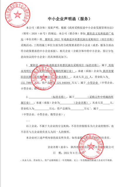 合同包1(紫阳县2022年戏曲进乡村惠民演出采购项目): 服务类(陕西省紫阳县民歌文化传播有限公司)