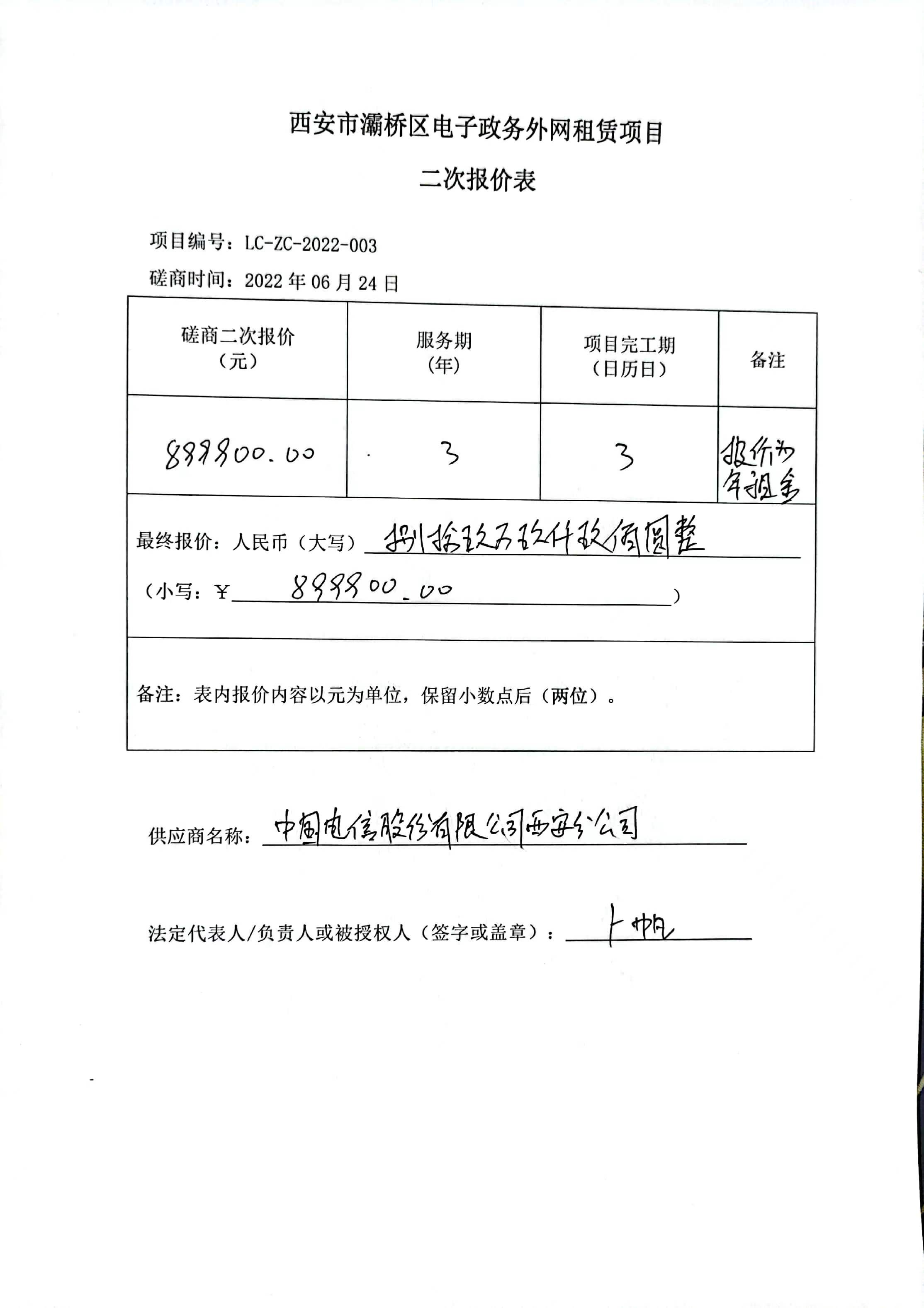 自本公告发布之日起1个工作日。 八、其他补充事宜中标金额为年租金,即899,900.00元/年。 九、凡对本次公告内容提出询问,请按以下方式联系。 1.采购人信息名称:西安市灞桥区人民政府办公室 地址:西安市灞桥区纺织城街道纺一路809号 联系方式:029-83524439 2.采购代理机构信息名称:陕西龙辰全过程工程咨询有限公司 地址:西安市未央区朱宏路3号陕西省统建办10楼(西安银行南侧) 联系方式:029-86350681 3.项目联系方式项目联系人:魏工、乔工 电话:029-86350681 陕西龙辰全过程工程咨询有限公司 2022年06月27日 相关附件: 西安市灞桥区人民政府办公室西安市灞桥区电子政务外网租赁项目中标(成交)明细.pdf 二次报价表.jpg 西安市灞桥区外网租赁项目(文件定稿).doc 十一、其他事项: ------------------------------------招标信息结束---------------------------- 标签: 中标 项目 西安市 电子政务 公告 政府办公室 灞桥区 上一篇: 2022年6月27日克拉玛依市独山子区高新技术产业园区基础设施项目(标准化厂房)-设计中标公告 最新5000条招标信息列表: 滚动招标 |