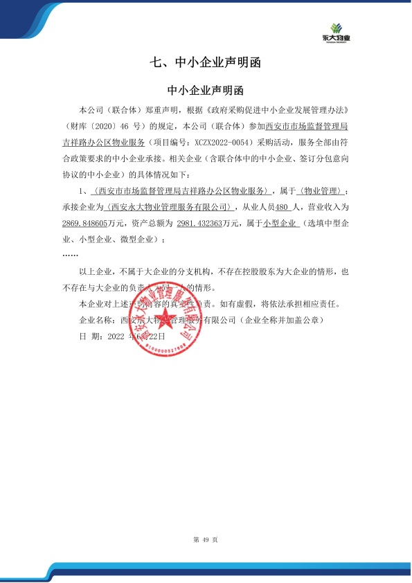 自本公告发布之日起1个工作日。 八、其他补充事宜1、本项目为专门面向中小企业采购项目,中标服务商性质详见附图。 2、请中标服务商于本项目公告期届满之日起前往西安市公共资源交易中心八楼领取中标通知书,同时须提交密封好的纸质投标文件一正两副,内容与电子投标文件完全一致。 九、凡对本次公告内容提出询问,请按以下方式联系。 1.采购人信息名称:西安市市场监督管理局 地址:凤城八路109号2号楼五层 联系方式:029-86788651 2.采购代理机构信息名称:西安市市级单位政府采购中心 地址:西安市未央区文景北路16号白桦林国际B座 联系方式:029-86510029 86510365转分机80808 3.项目联系方式项目联系人:029-86510029 86510365转分机80808 电话:029-86510029 86510365转分机80808 西安市市级单位政府采购中心 2022年06月27日 相关附件: 西安市市场监督管理局吉祥路办公区物业服务中标(成交)明细.pdf XCZX2022-0054西安市市场监督管理局吉祥路办公区物业服务.doc 中小企业声明函.jpg 十一、其他事项: ------------------------------------招标信息结束---------------------------- 标签: 中标 项目 西安市 政府采购 监督管理局 物业服务 公告 上一篇: 2022年6月27日岐山县教育体育局岐山县城关幼儿园维修改造中标(成交)结果公告 最新5000条招标信息列表: 滚动招标 |