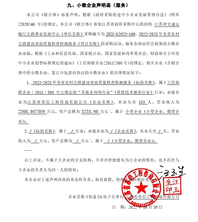 五、评审专家名单:程东祥,戴兆华,高小俊,刘睿,沈建涛,袁平,缪岩 六、代理服务收费标准及金额:本项目不收取代理服务费。 七、公告期限 自本公告发布之日起1个工作日。 八、其他补充事宜 电子投标项目,请中标供应商在中标结果公告届满之日起30日内,使用CA数字证书登录“江苏省政府采购交易执行系统”及时下载中标通知书。因系统存储空间有限,自中标结果公告届满之日起30日后,“江苏省政府采购交易执行系统”不再保证提供下载中标通知书服务,因未及时下载而造成的不利后果由中标供应商自行承担。纸质投标项目,江苏省采购中心将以中国邮政EMS的形式向中标供应商寄送中标通知书。 九、本次中标公告联系方式 1.采购人信息 名 称:江苏省交通运输厅公路事业发展中心 地 址:南京市石鼓路69号 联系人:沈建涛 联系方式:025-84211918 2.江苏省政府采购中心信息 名 称:江苏省政府采购中心 地 址:南京市汉中门大街145号江苏省公共资源交易中心二期3楼 联系人:付钢 联系方式:025-83668520 十、附件 1.采购文件。 2.中标供应商为中小企业的《中小企业声明函》。 |
