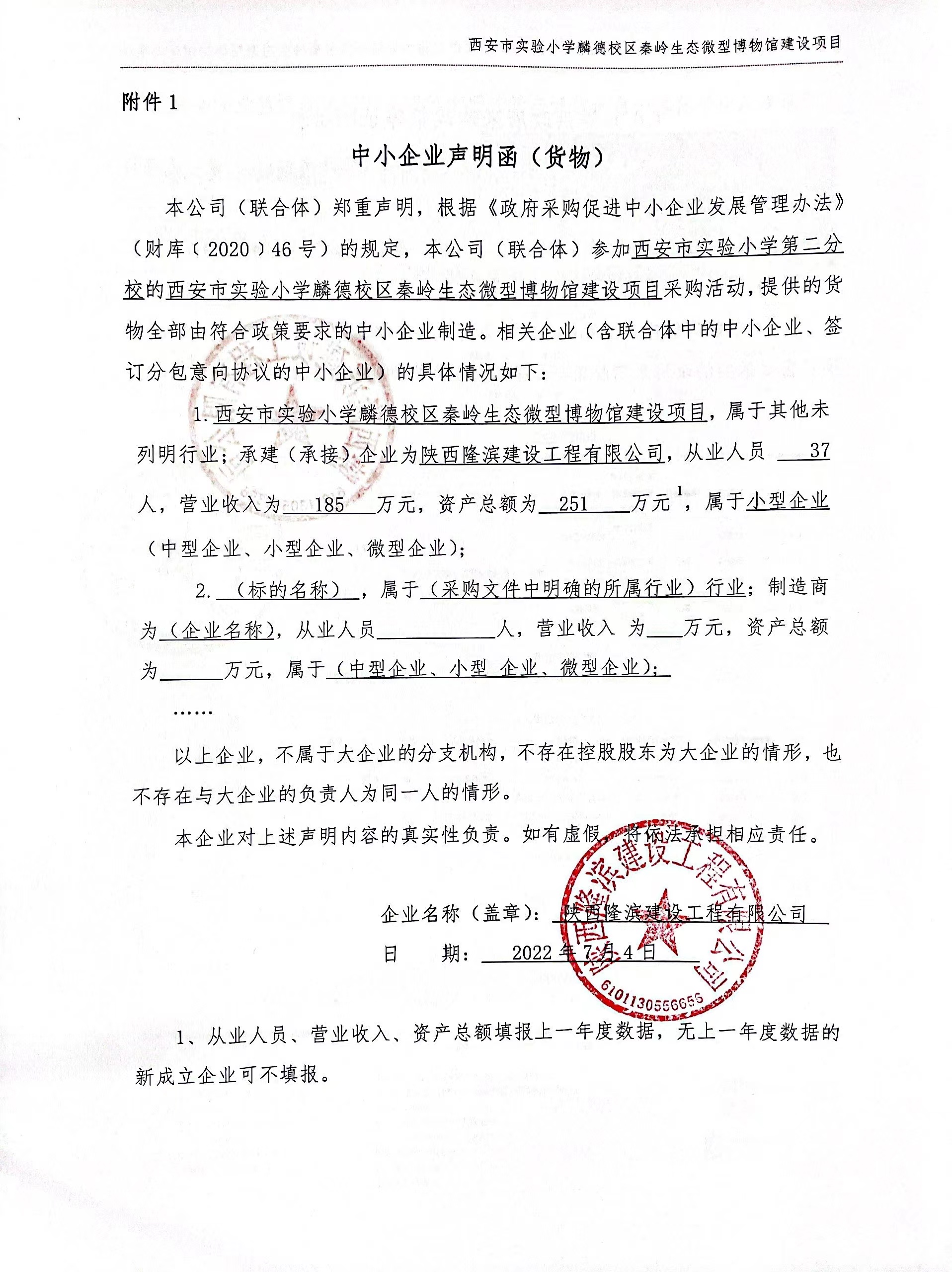 自本公告发布之日起1个工作日。 八、其他补充事宜本项目中标单位承诺为小型企业,特此公示,接受社会监督。 九、凡对本次公告内容提出询问,请按以下方式联系。 1.采购人信息名称:西安市实验小学第二分校 地址:西安市新城区联志村116号 联系方式:西安市实验小学第二分校经办 13892805582 2.采购代理机构信息名称:陕西笃信招标有限公司 地址:西安经济技术开发区凤城十一路与文景路十字文景商务广场B座8层 联系方式:029-86253389 3.项目联系方式项目联系人:黄安舒、李纪旋 电话:029-86253389 陕西笃信招标有限公司 2022年07月05日 相关附件: 西安市实验小学第二分校秦岭生态微型博物馆建设项目中标(成交)明细.pdf DX2022-151西安市实验小学麟德校区秦岭生态微型博物馆建设项目(定稿).docx 中小企业声明函.jpg 最终磋商报价表.jpg 十一、其他事项: ------------------------------------招标信息结束---------------------------- 标签: 秦岭 西安市 校区 建设项目 实验小学 博物馆 生态 上一篇: 2022年7月5日2022年广州番禺职业技术学院信息化建设项目(双高)-智慧教室-智慧教室(二期)项目结果公告 最新5000条招标信息列表: 滚动招标 |