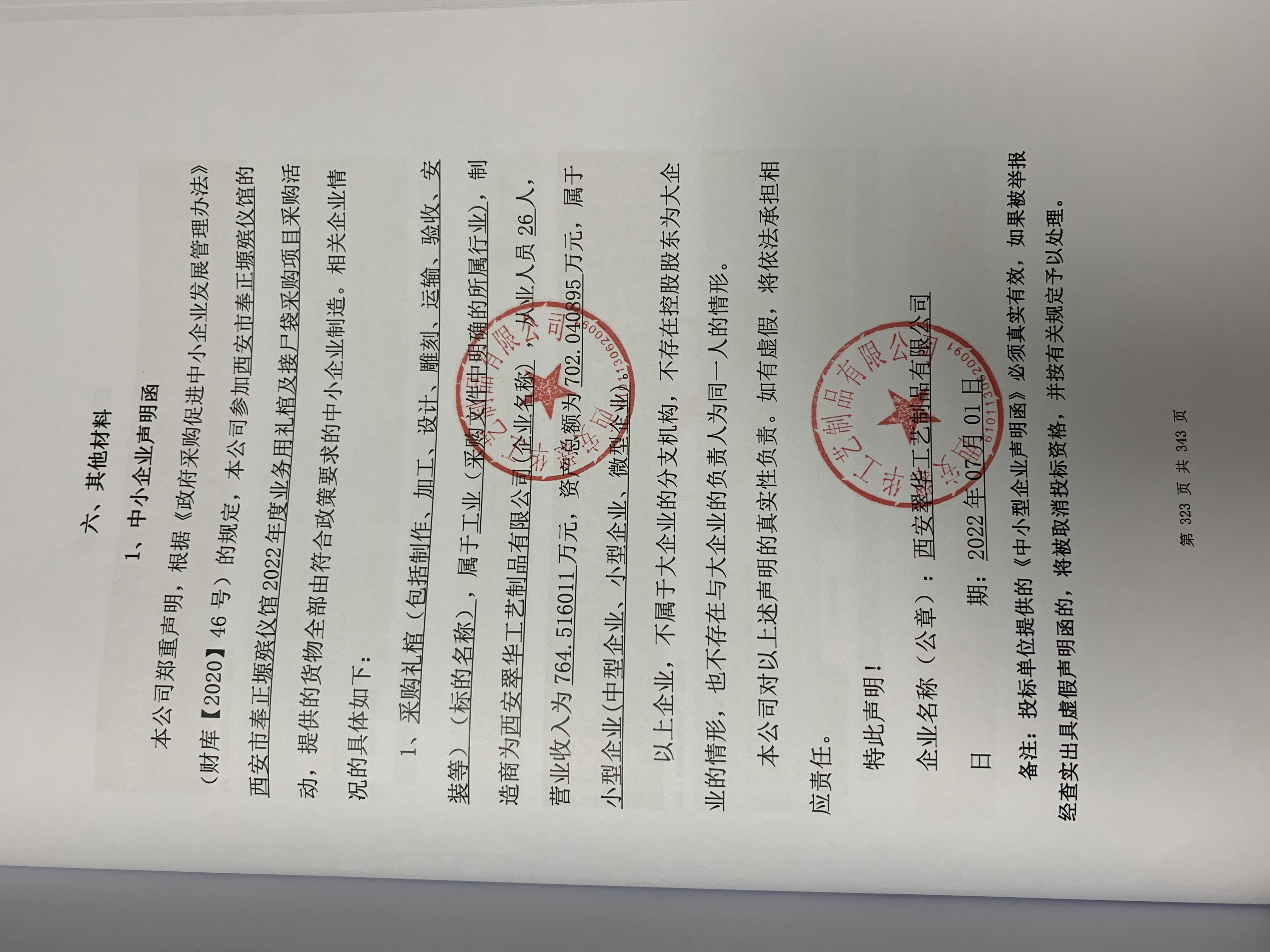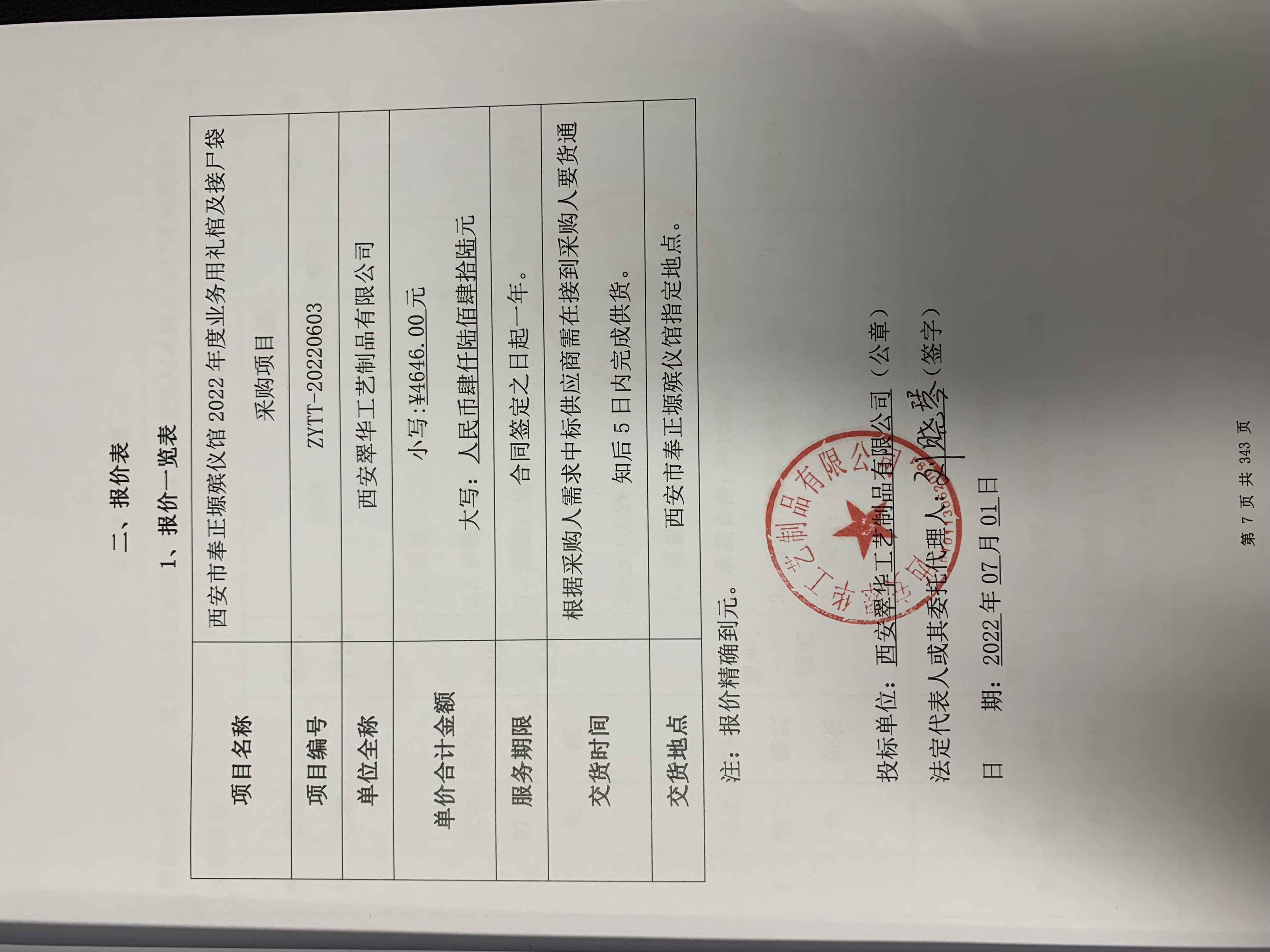 自本公告发布之日起1个工作日。 八、其他补充事宜单价合计金额为4646元/个,其中各火化馆单价为:火化馆一类96/个、火化馆二类210/个、火化馆三类300/个、火化馆四类370/个、火化馆五类420/个、火化馆六类520/个、火化馆七类790/个、火化馆八类890/个、火化馆八类1050/个。 最终结算金额按月据实结算货款,实际结算金额=实际销售数量×中标成交单价 九、凡对本次公告内容提出询问,请按以下方式联系。 1.采购人信息名称:西安市奉正塬殡仪馆 地址:陕西省西安市高陵区马北村 联系方式:18192399676 2.采购代理机构信息名称:陕西中裕天腾项目管理有限公司 地址:西安市新城区长乐中路 38 号金花新都汇 A 座 7 层 701 室 联系方式:18629427503 3.项目联系方式项目联系人:赵婕 电话:18629427503 陕西中裕天腾项目管理有限公司 2022年07月06日 相关附件: 西安市奉正塬殡仪馆2022年度业务用礼棺及接尸袋采购项目中标(成交)明细.pdf 报价表.jpg 分项报价表.pdf 中小企业声明函.jpg 主要标的清单.doc 西安市奉正塬殡仪馆2022年度业务用礼棺及接尸袋采购项目(第一包)公开招标文件.pdf 十一、其他事项: ------------------------------------招标信息结束---------------------------- 标签: 项目 中标 采购 西安市 殡仪馆 年度 业务 上一篇: 2022年7月6日东营市特种设备检验研究院特种专业技术用车(专业技术用车1)成交公告 最新5000条招标信息列表: 滚动招标 |