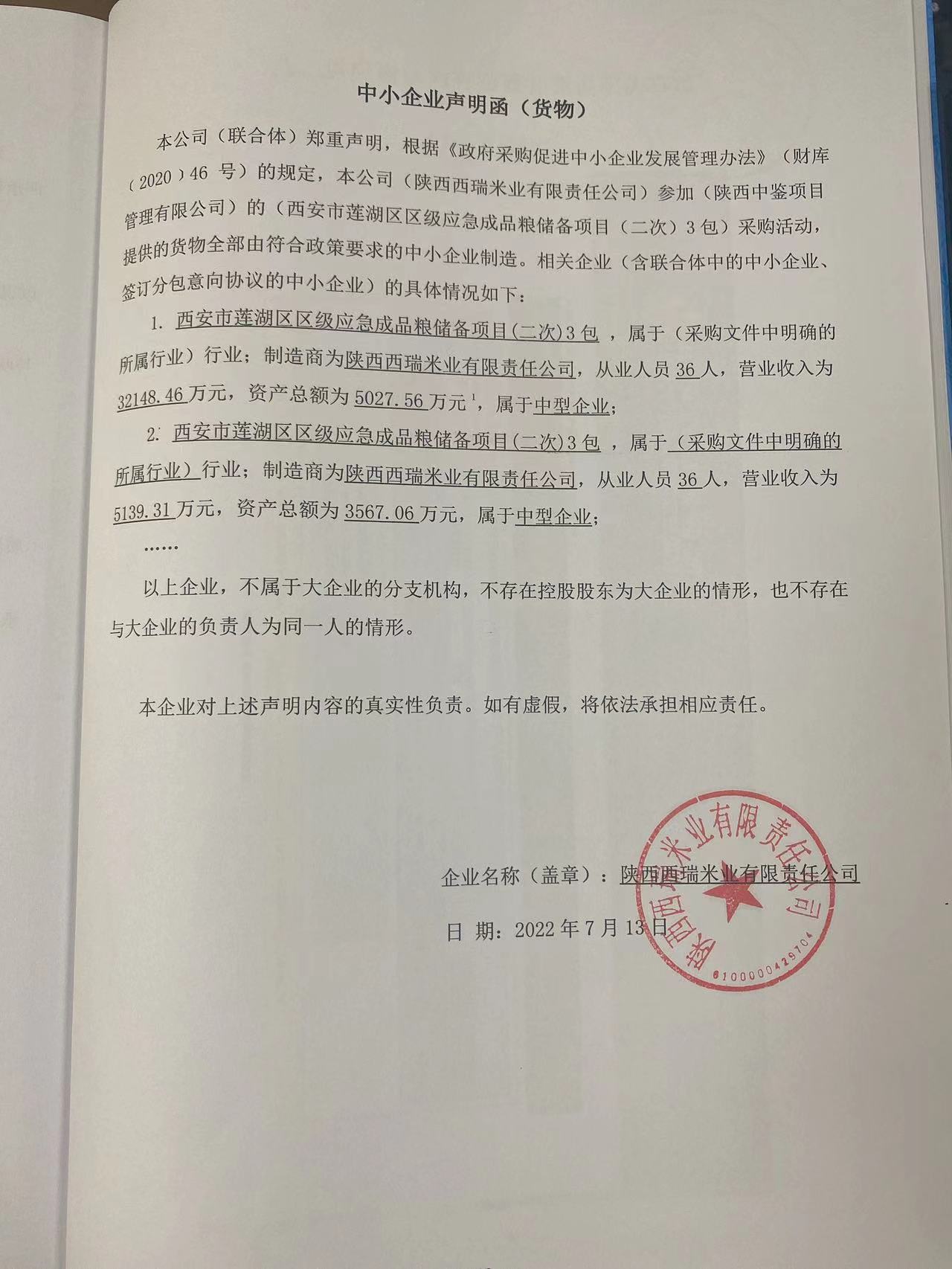 ----------------------------------招标机构发布信息原文:----------------------- <meta http-equiv="content-type" content="text/html;charset=utf-8"> 一、项目编号:ZJXG2022015.1.2.3B1 二、项目名称:西安市莲湖区区级应急成品粮储备项目(二次) 三、采购结果 合同包3(莲湖区区级应急成品粮储备项目(二次)(3包)):