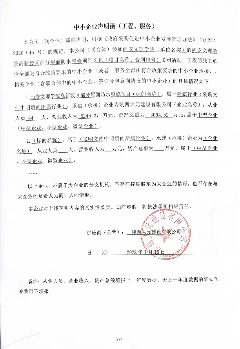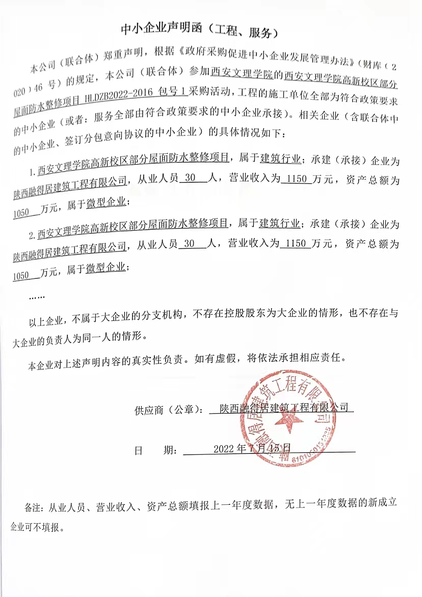 自本公告发布之日起1个工作日。 八、其他补充事宜/ 九、凡对本次公告内容提出询问,请按以下方式联系。 1.采购人信息名称:西安文理学院(本级) 地址:西安市雁塔区科技六路1号 联系方式:029-88258528 2.采购代理机构信息名称:西安华力达项目管理有限公司 地址:西安市经济技术开发区凤城八路168号西北国金中心F座5楼 联系方式:029-89666676 3.项目联系方式项目联系人:张思瑶 电话:029-89666676 西安华力达项目管理有限公司 2022年07月19日 相关附件: 西安文理学院(本级)西安文理学院高新校区部分屋面防水整修项目中标(成交)明细.pdf 中小企业声明函1.jpg 中小企业声明函2.jpg 中小企业声明函3.jpg 中小企业声明函4.jpg 西安文理学院高新校区部分屋面防水整修项目竞争性磋商文件.doc 十一、其他事项: ------------------------------------招标信息结束---------------------------- 标签: 项目 中标 西安 文理学院 屋面 校区 公告 上一篇: 2022年7月19日邹平市黛溪小学塑胶场地铺设项目中标(成交)公告 最新5000条招标信息列表: 滚动招标 |