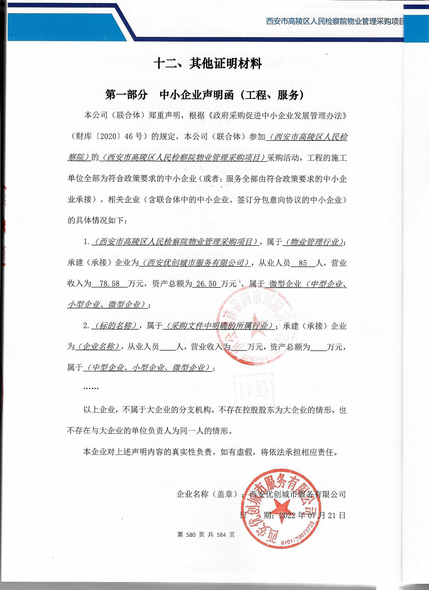 合同包1(西安市高陵区人民检察院物业管理项目): 服务类(西安优创城市服务有限公司)
