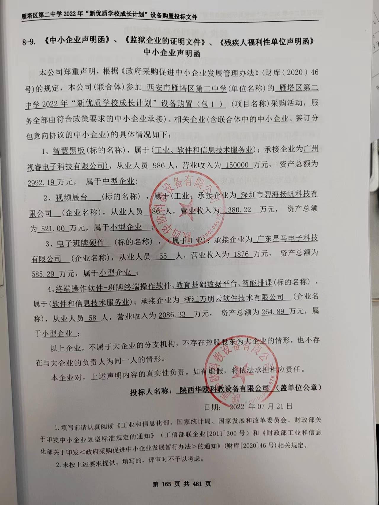 自本公告发布之日起1个工作日。 八、其他补充事宜无 九、凡对本次公告内容提出询问,请按以下方式联系。 1.采购人信息名称:西安市雁塔区第二中学 地址:西安市雁塔区西沣四路与沈家桥二路口 联系方式:029-81166903 2.采购代理机构信息名称:陕西教育招标有限责任公司 地址:陕西省西安市市辖区陕西省西安市太白南路181号西部电子社区A座B区401 联系方式:029-8824929 3.项目联系方式项目联系人:鲁方方 电话:029-8824929 陕西教育招标有限责任公司 2022年07月25日 相关附件: 西安市雁塔区第二中学雁塔区第二中学2022年“新优质学校成长计划”设备购置中标(成交)明细.pdf 主要标的信息-二中.docx 中小企业声明函.jpg 招标文件 (发售稿).doc 十一、其他事项: ------------------------------------招标信息结束---------------------------- 标签: 中标 西安市 第二中学 计划 学校 公告 设备 上一篇: 2022年7月25日礼泉县城北大道绿化景观项目绿化养护公司采购项目中标(成交)结果公告 最新5000条招标信息列表: 滚动招标 |