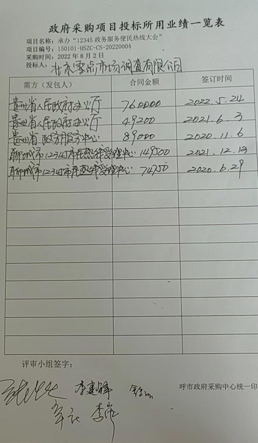 辛庄(采购人代表)、张跃、李岚、李建锋、金彩云 六、代理服务收费标准及金额:代理服务费收费标准: 无 代理服务费金额: 合同包1(会议服务): 0万元。收取对象:无。 七、公告期限自本公告发布之日起1个工作日。 八、其他补充事宜凡已在内蒙古自治区政府采购云平台供应商登记库中登记,并依法取得内蒙古自治区内政府采购合同的区内中小企业(含个体工商户)供应商,均可申请政府采购合同融资。(https://www.ccgp-neimenggu.gov.cn/zcdservice/Zcd/neimeng/LoanProduct) 九、凡对本次公告内容提出询问,请按以下方式联系。 1.采购人信息名称:呼和浩特市接诉即办指挥调度中心 地址:呼和浩特市赛罕区敕勒川大街6号 联系方式:15849392536 2.采购代理机构信息名称:呼和浩特市政府采购中心 地址:内蒙古自治区呼和浩特市新城区呼和浩特市丁香路2号 联系方式:0471-5988129 3.项目联系方式项目联系人:刘女士 电话:0471-5988129 呼和浩特市政府采购中心 2022年08月02日 相关附件: 合同包1:中小企业或残疾人福利单位声明函(北京零点市场调查有限公司).pdf 承办“12345政务服务便民热线大会”报价明细附件.pdf 业绩.jpg 十一、其他事项: ------------------------------------招标信息结束---------------------------- 标签: 呼和浩特市 政务 大会 公告 热线 中心 接诉即办 上一篇: 2022年8月2日陕西省人民医院西咸院区信息系统建设-LIS检验管理系统中标(成交)结果公告 最新5000条招标信息列表: 滚动招标 |