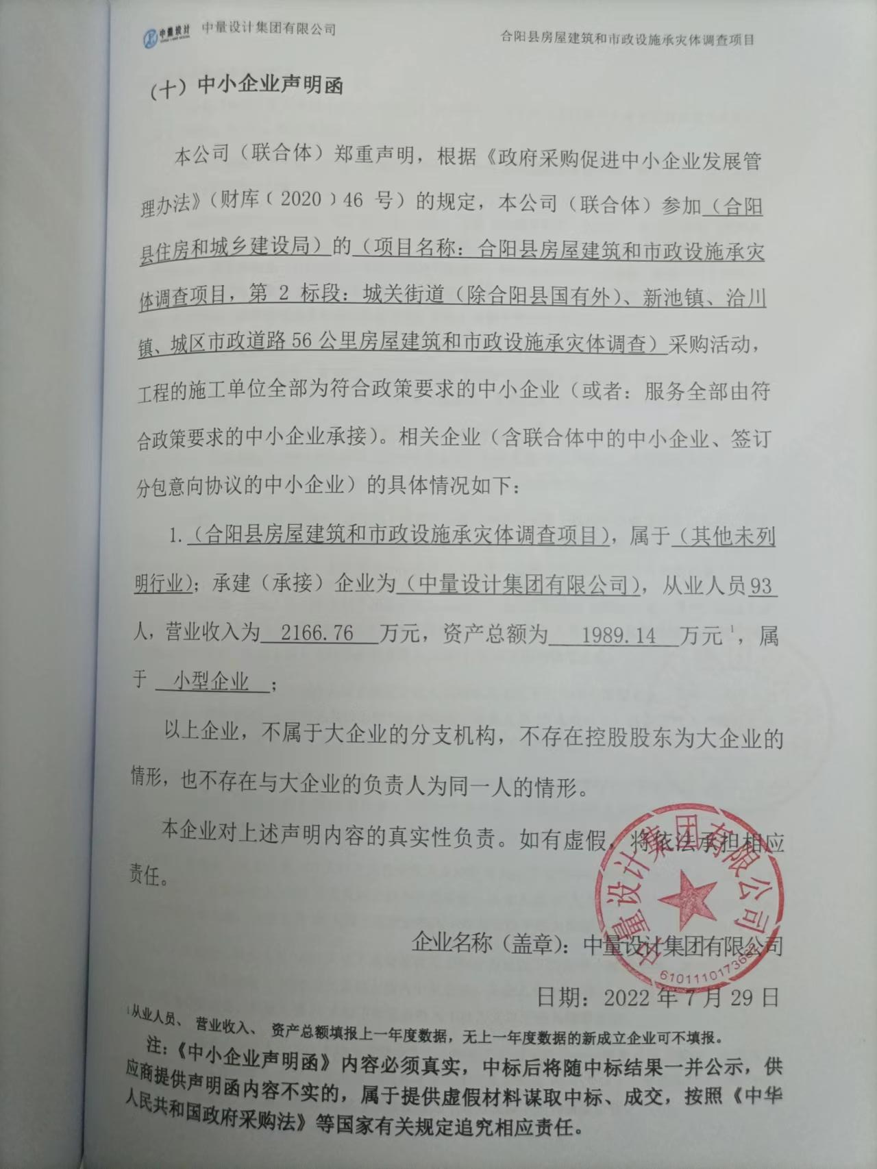 自本公告发布之日起1个工作日。 八、其他补充事宜一标段中标单位作为合阳县房屋建筑与市政设施承灾体调查的技术服务单位。 九、凡对本次公告内容提出询问,请按以下方式联系。 1.采购人信息名称:合阳县住房和城乡建设局 地址:合阳县凤凰西街住建局 联系方式:0913-3130989 2.采购代理机构信息名称:陕西诺诚鑫达招标代理有限公司 地址:陕西省西安市莲湖区高新三路财富中心二期B座21811室 联系方式:029-68805822 3.项目联系方式项目联系人:王晓迎 电话:029-68805822 陕西诺诚鑫达招标代理有限公司 2022年08月03日 相关附件: 合阳县住房和城乡建设局合阳县房屋建筑和市政设施承灾体调查项目中标(成交)明细.pdf 二标段中小企业声明函.jpg 一标段中小企业声明函.jpg 四标段中小企业声明函.jpg 三标段中小企业声明函.jpg 合阳县房屋建筑和市政设施承灾体调查项目招标文件(定稿).docx 一标段开标一览表.jpg 二标段开标一览表.jpg 三标段开标一览表.jpg 四标段开标一览表.jpg 十一、其他事项: ------------------------------------招标信息结束---------------------------- 标签: 中标 项目 合阳县 建设局 城乡 房屋建筑 市政 上一篇: 2022年8月3日购买专业技术服务开展2022年航城街道工业园区应急能力提升项目中标结果公示 最新5000条招标信息列表: 滚动招标 |