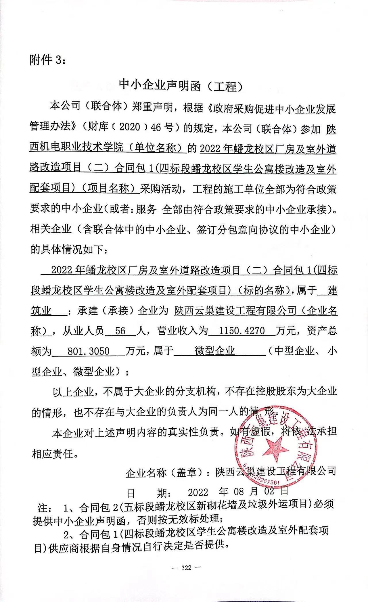 合同包1(四标段蟠龙校区学生公寓楼改造及室外配套项目): 工程类(陕西云巢建设工程有限公司)