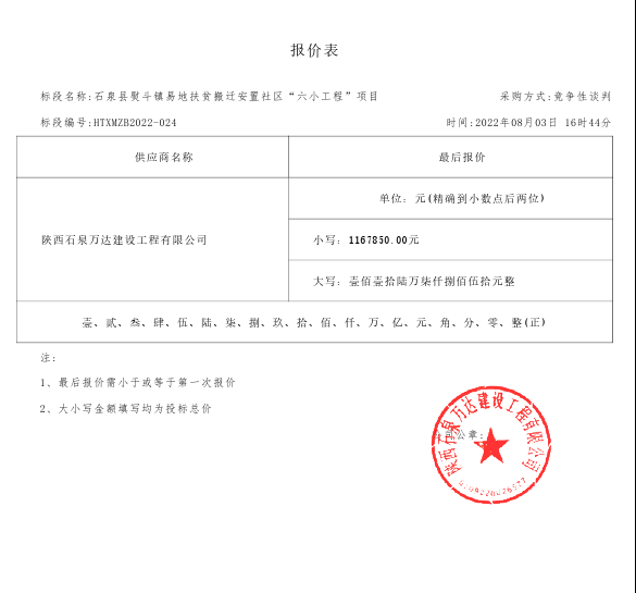 自本公告发布之日起1个工作日。 八、其他补充事宜无 九、凡对本次公告内容提出询问,请按以下方式联系。 1.采购人信息名称:石泉县熨斗镇人民政府 地址:石泉县熨斗镇集镇中街 联系方式:0915-6791120 2.采购代理机构信息名称:陕西华泰工程项目管理有限公司 地址:陕西省西安市经开区凤城五路世融嘉轩5号楼27层 联系方式:029-86250354 3.项目联系方式项目联系人:张工 电话:029-86250354 陕西华泰工程项目管理有限公司 2022年08月04日 相关附件: 石泉县熨斗镇人民政府石泉县熨斗镇易地扶贫搬迁安置社区“六小工程”项目中标(成交)明细.pdf 报价表.png 中小企业声明.pdf 竞争性谈判文件-定稿.pdf 竞争性谈判文件-定稿.pdf 十一、其他事项: ------------------------------------招标信息结束---------------------------- 标签: 项目 工程 石泉县 熨斗 公告 社区 上一篇: 2022年8月4日靖边县司法局部门法律顾问采购项目中标(成交)结果公告 最新5000条招标信息列表: 滚动招标 |