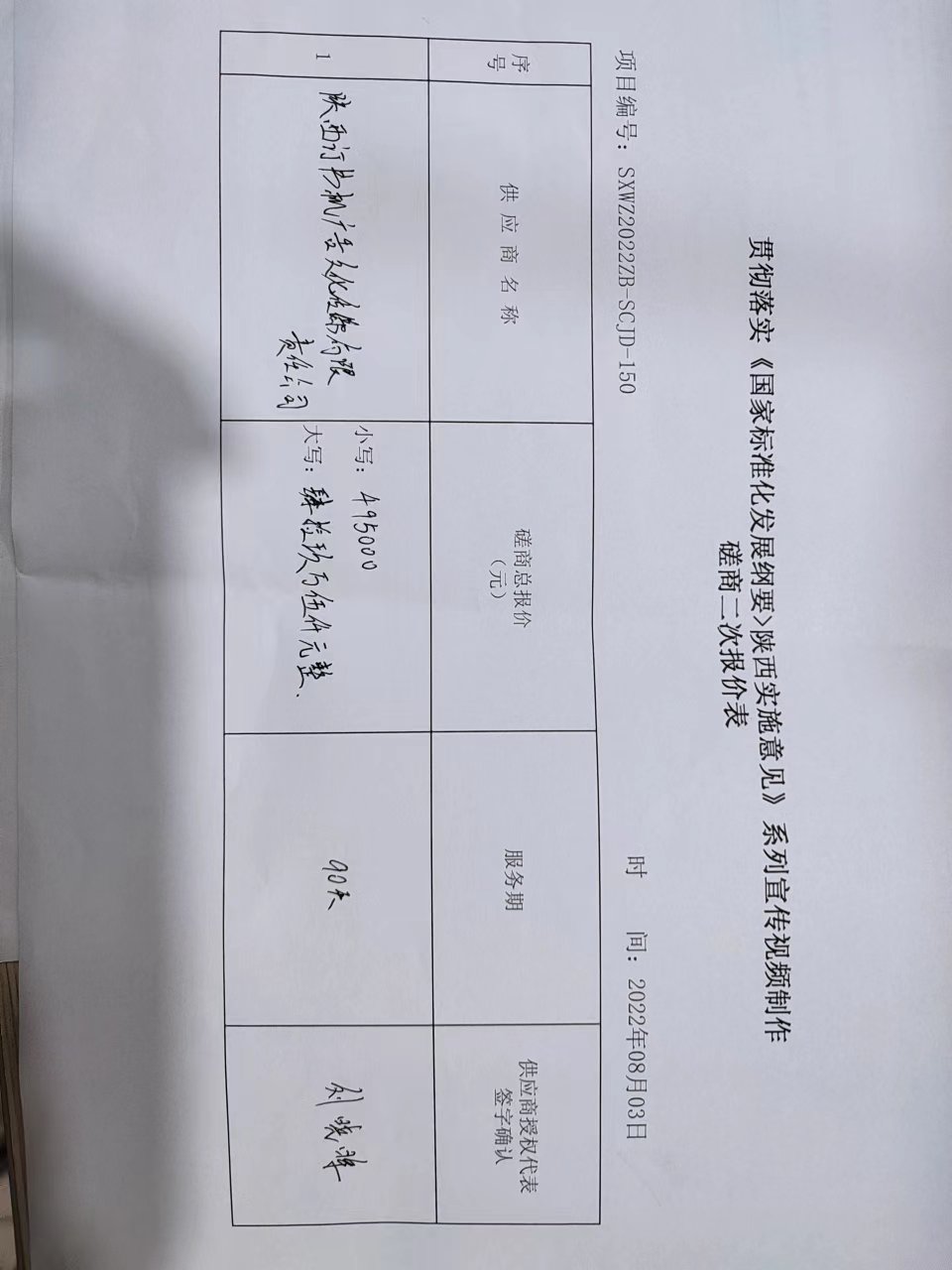 ----------------------------------招标机构发布信息原文:----------------------- <meta http-equiv="content-type" content="text/html;charset=utf-8"> 一、项目编号:SXWZ2022ZB-SCJD-150 二、项目名称:贯彻落实《国家标准化发展纲要陕西实施意见》系列宣传视频制作 三、采购结果 合同包1(贯彻落实《国家标准化发展纲要陕西实施意见》系列宣传视频制作):
