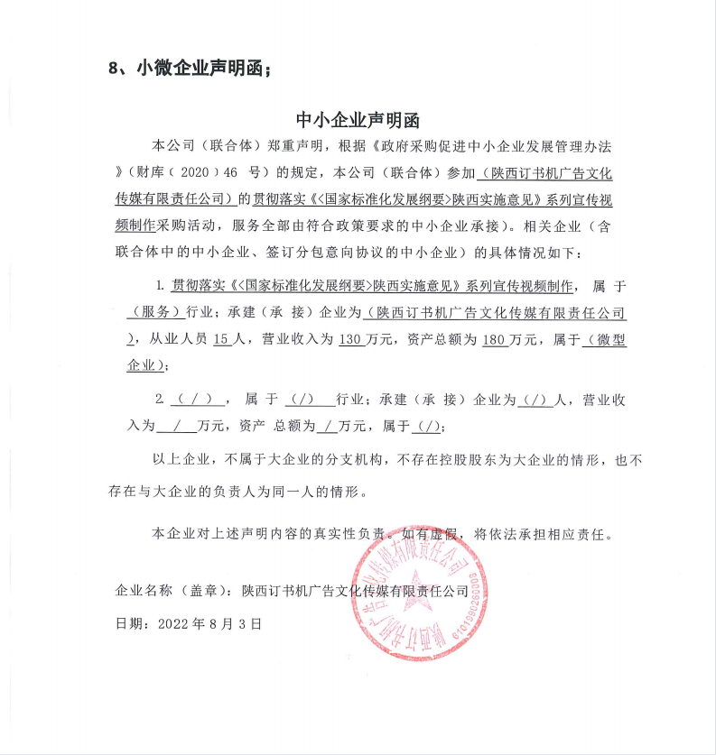 合同包1(贯彻落实《国家标准化发展纲要陕西实施意见》系列宣传视频制作): 服务类(陕西订书机广告文化传媒有限责任公司)