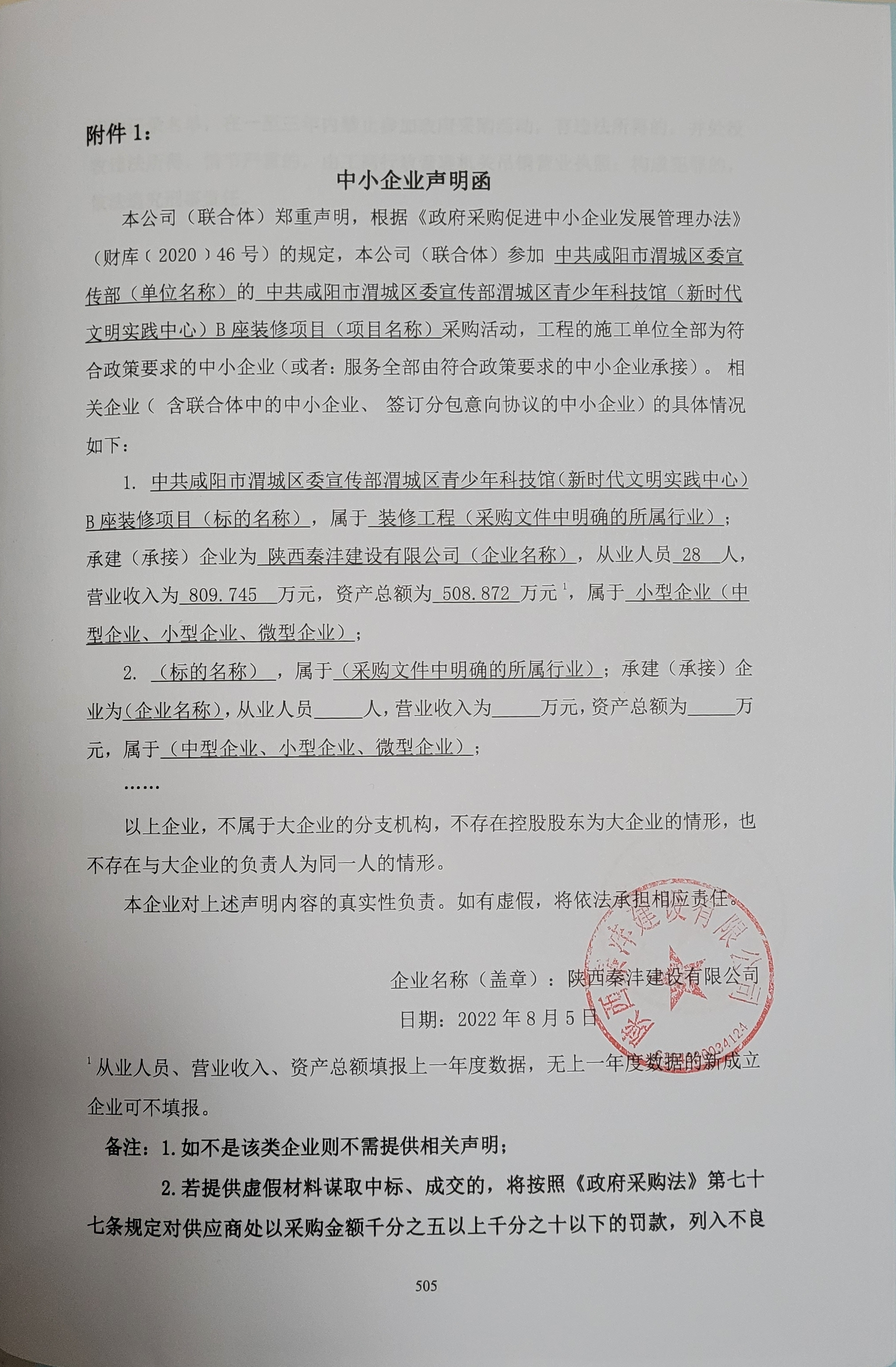自本公告发布之日起1个工作日。 八、其他补充事宜无 九、凡对本次公告内容提出询问,请按以下方式联系。 1.采购人信息名称:中共咸阳市渭城区委宣传部 地址:陕西省咸阳市渭城区文林路9号 联系方式:029-33188981 2.采购代理机构信息名称:亿诚建设项目管理有限公司 地址:陕西省西安市雁塔区吉祥路135号 联系方式:18629311481 3.项目联系方式项目联系人:刘庆 电话:18629311481 亿诚建设项目管理有限公司 2022年08月07日 相关附件: 渭城区委宣传部渭城区青少年科技馆(新时代文明实践中心)B座装修项目中标(成交)明细.pdf 装修磋商文件(1).pdf 中小企业声明函1.jpg 中小企业声明函2.jpg 十一、其他事项: ------------------------------------招标信息结束---------------------------- 标签: 中标 项目 宣传部 城区 咸阳市 新时代 中共 上一篇: 2022年8月7日洪厝坟段路面拓宽工程结果公告 最新5000条招标信息列表: 滚动招标 |
