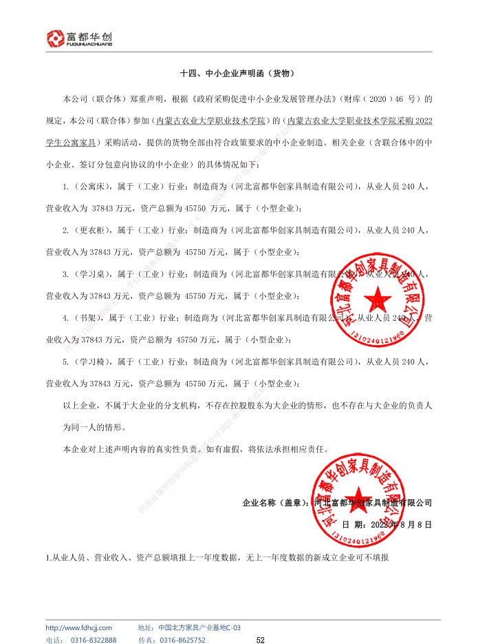 合同包1(学生公寓家具): 货物类(河北富都华创家具制造有限公司)