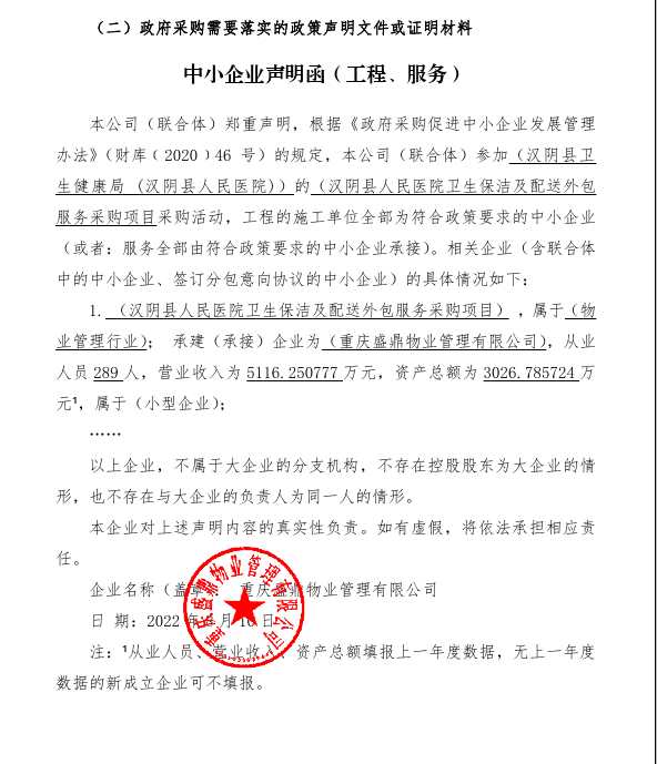 自本公告发布之日起1个工作日。 八、其他补充事宜无 九、凡对本次公告内容提出询问,请按以下方式联系。 1.采购人信息名称:汉阴县卫生健康局(汉阴县人民医院) 地址:汉阴县泰和路中段 联系方式:5212004 2.采购代理机构信息名称:陕西顶诚招标有限公司 地址:陕西省西安市灞桥区西安市灞桥区长乐东路2999号京都国际1号楼2单元29层22902号房 联系方式:029-83479858-802 3.项目联系方式项目联系人:袁箔 黄建峰 王景华 电话:029-83479858-802 陕西顶诚招标有限公司 2022年08月11日 相关附件: 汉阴县卫生健康局汉阴县人民医院卫生保洁及配送外包服务采购项目中标(成交)明细.pdf 中小企业声明函.jpg 报价一览表.jpg 汉阴县人民医院卫生保洁及配送外包服务采购项目-发售稿7.18.doc 十一、其他事项: ------------------------------------招标信息结束---------------------------- 标签: 项目 中标 采购 汉阴县 人民医院 外包服务 公告 上一篇: 2022年8月11日仁化县董塘镇中心卫生院业务楼建设项目医用中心供氧系统中标公告 最新5000条招标信息列表: 滚动招标 |
