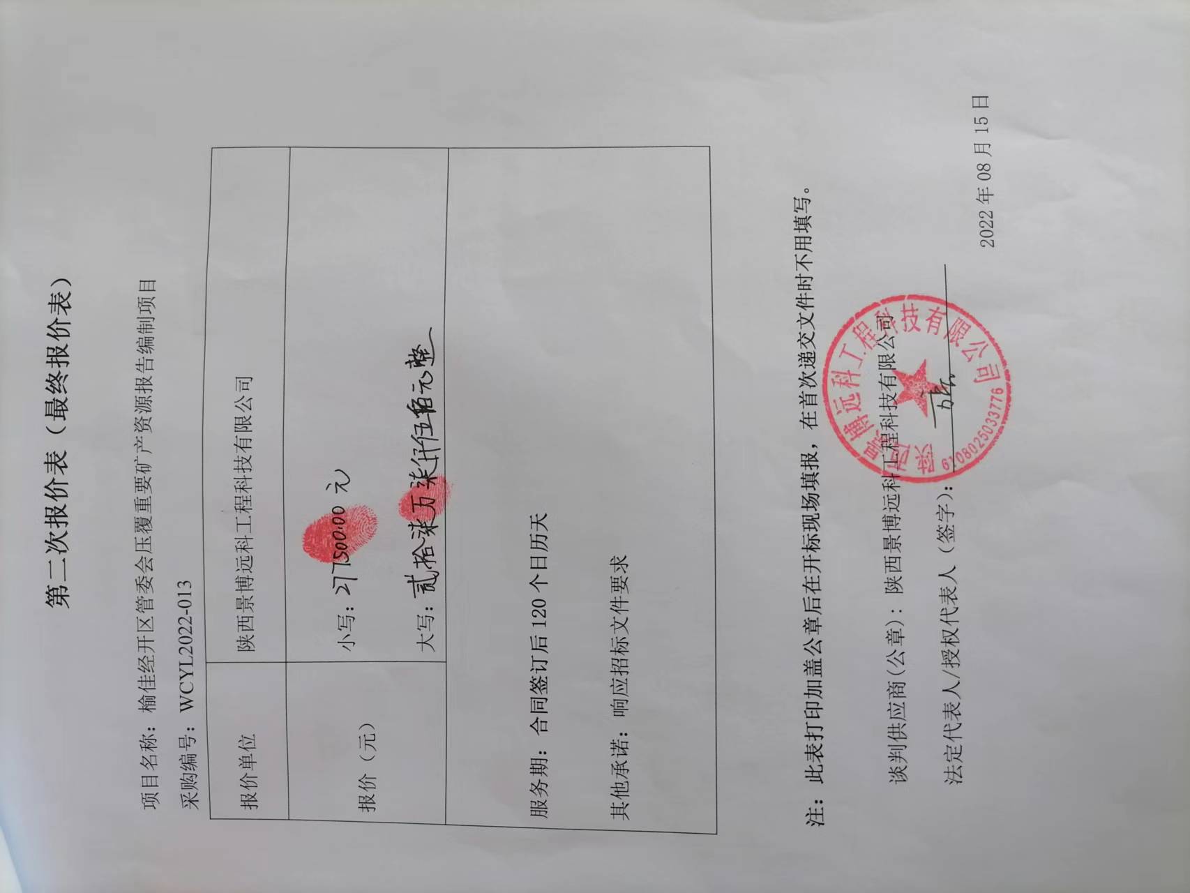 自本公告发布之日起1个工作日。 八、其他补充事宜无 九、凡对本次公告内容提出询问,请按以下方式联系。 1.采购人信息名称:榆佳经济技术开发区管理委员会 地址:佳县榆佳工业园区 联系方式:18966967210 2.采购代理机构信息名称:伍诚工程咨询股份有限公司 地址:榆林市航宇路国家粮食储备库北10米3楼 联系方式:0912-3232342 3.项目联系方式项目联系人:高工 电话:13379426672 伍诚工程咨询股份有限公司 2022年08月16日 相关附件: 榆佳经济技术开发区管理委员会榆佳经开区管委会压覆重要矿产资源报告编制项目中标(成交)明细.pdf 013榆佳压覆重要矿产资源报告编制.pdf 二次报价 (1).jpg 中小企业声明函.jpg 十一、其他事项: ------------------------------------招标信息结束---------------------------- 标签: 中标 项目 管委会 矿产资源 管理委员会 经济技术 开发区 上一篇: 2022年8月16日若尔盖县中学食堂食材采购项目中标(成交)结果公告 最新5000条招标信息列表: 滚动招标 |