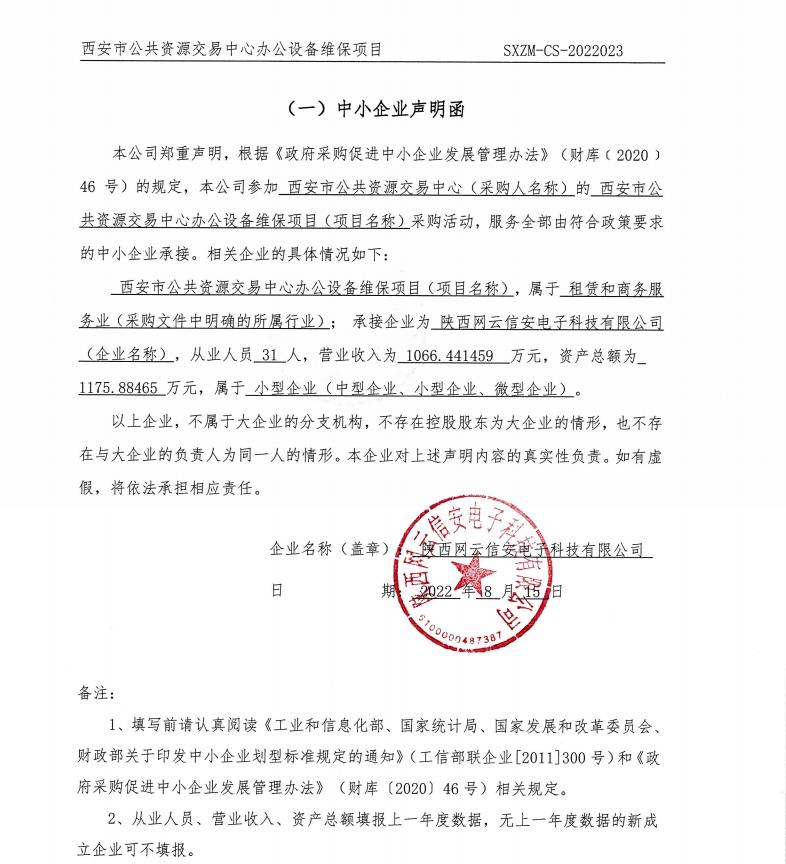 自本公告发布之日起1个工作日。 八、其他补充事宜/ 九、凡对本次公告内容提出询问,请按以下方式联系。 1.采购人信息名称:西安市公共资源交易中心 地址:西安经济技术开发区文景路(中段)16号白桦林国际B座1-11层 联系方式:029-86510029 2.采购代理机构信息名称:陕西正明项目管理有限公司 地址:陕西省西安市雁塔区科技二路71号竹园天寰国际1807室 联系方式:029-62695995 3.项目联系方式项目联系人:任冰倩 电话:029-62695995 陕西正明项目管理有限公司 2022年08月17日 相关附件: 西安市公共资源交易中心办公设备维保中标(成交)明细.pdf 【0802定稿】办公设备维保磋商文件.pdf 中小企业声明函(办公设备维保).jpg 十一、其他事项: ------------------------------------招标信息结束---------------------------- 标签: 西安市 交易中心 办公设备 公共资源 公告 上一篇: 2022年8月17日白云湖街嘉禾涌、夏茅涌、均禾涌、环滘河水面及堤岸保洁管养采购项目(二次)结果公告 最新5000条招标信息列表: 滚动招标 |