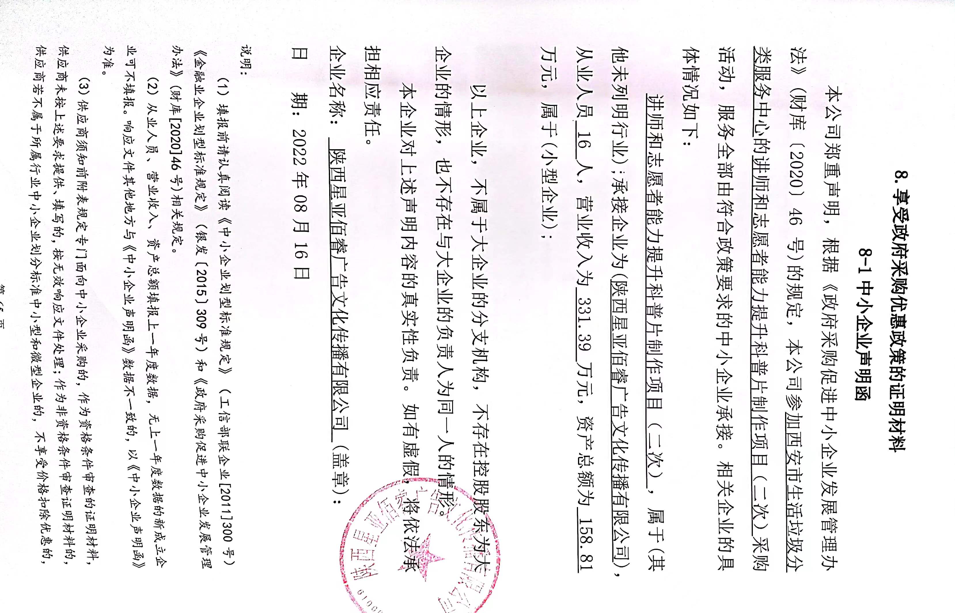 自本公告发布之日起1个工作日。 八、其他补充事宜1、本项目竞争性磋商公告发布日期:2022年08月02日。2、成交结果确认日期:2022年08月17日。3、成交供应商联系人:岳李娜,联系电话:17691232787。 九、凡对本次公告内容提出询问,请按以下方式联系。 1.采购人信息名称:西安市生活垃圾分类服务中心 地址:西安市莲湖区华弘大厦4楼 联系方式:029-89387173 2.采购代理机构信息名称:陕西国采项目管理有限公司 地址:西安市高新区丈八一路2号绿地SOHO同盟B座19层1911室 联系方式:029-81130182 18049538114 3.项目联系方式项目联系人:李工 电话:029-81130182 18049538114 陕西国采项目管理有限公司 2022年08月17日 相关附件: 西安市生活垃圾分类服务中心讲师和志愿者能力提升科普片制作项目(二次)中标(成交)明细.pdf 014二次生活垃圾分类中心科普片制作项目磋商文件--发标版.pdf 中小企业声明函.jpg 十一、其他事项: ------------------------------------招标信息结束---------------------------- 标签: 项目 西安市 讲师 志愿者 生活垃圾 服务中心 能力 上一篇: 2022年8月17日国家税务总局天水市税务局干部职工体检定点采购项目中标公告 最新5000条招标信息列表: 滚动招标 |