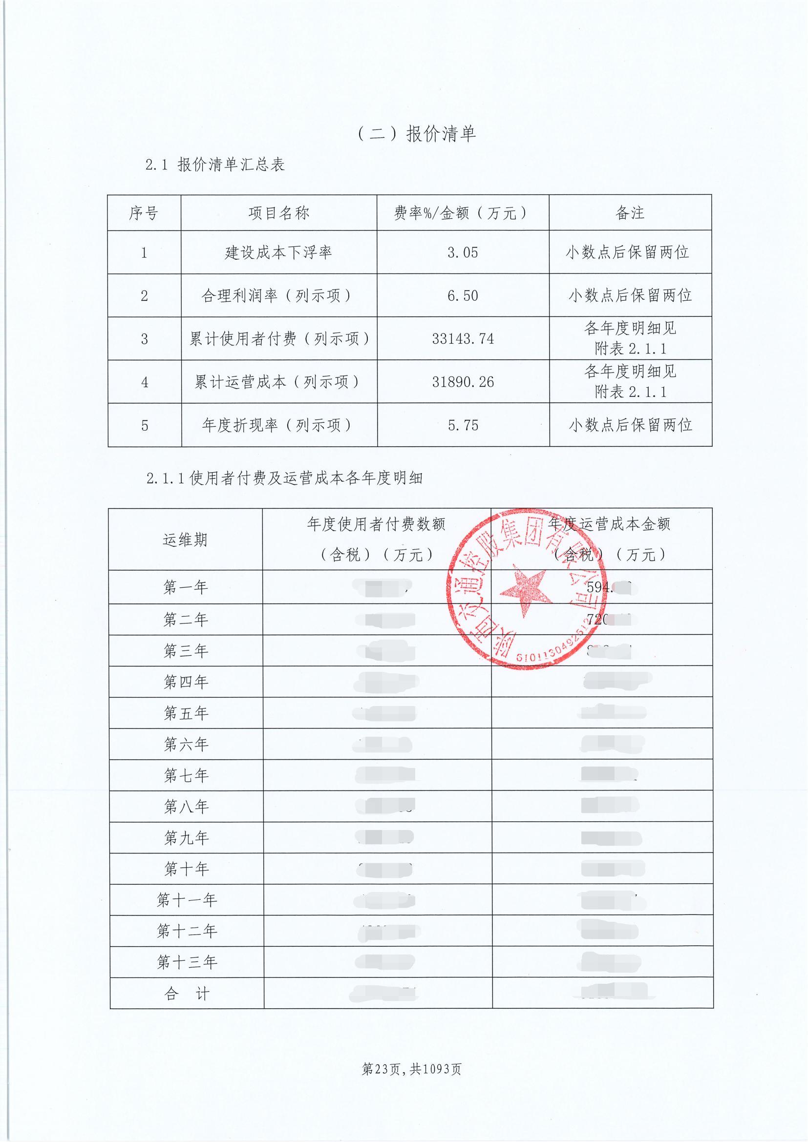 自本公告发布之日起1个工作日。 八、其他补充事宜主要中标条件: 1.牵头单位名称:陕西交通控股集团有限公司 2.组成单位名称:陕西路桥集团有限公司、陕西省交通规划设计研究院有限公司 3.采购结果确认谈判工作组成员名单: 田慧枫、张峰、李朋、张华、崔晓颖、刘阿强、党永强、王斌斌、司飞展、甘立健、罗贤 4.中标金额:建设成本下浮率:3.05%;合理利润率(列示项):6.50%;累计使用者付费(列示项):33143.74万元;累计运营成本(列示项):31890.26万元;年度折现率(列示项):5.75%。本项目中标金额1648782986.55元,是根据项目合作投资估算1700652900.00元按3.05%(中标下浮率)下浮后得出。 5.合作期限:建设期3年,运营期13年。 九、凡对本次公告内容提出询问,请按以下方式联系。 1.采购人信息名称:西安市交通运输局(本级) 地址:西安市含光南路218号交通信息大厦9楼 联系方式:18209228339 2.采购代理机构信息名称:陕西纵横项目管理有限公司 地址:西安市经开区凤城五路赛高街区A座902室 联系方式:029-86252018 3.项目联系方式项目联系人:郭工 电话:029-86252018 陕西纵横项目管理有限公司 2022年08月17日 相关附件: 西安市交通运输局(本级)东三环~临潼公路PPP项目社会资本方政府采购中标(成交)明细.pdf (定)东三环~临潼公路PPP项目社会资本方政府采购采购文件.pdf 报价清单.jpg 十一、其他事项: ------------------------------------招标信息结束---------------------------- 标签: 中标 项目 西安市 政府采购 交通运输 东三环 资本 上一篇: 2022年8月17日四川省乐山市第一职业高级中学2022年至2023年食堂食材及烹饪专业耗材供货商采购中标(成交)结果公告 最新5000条招标信息列表: 滚动招标 |