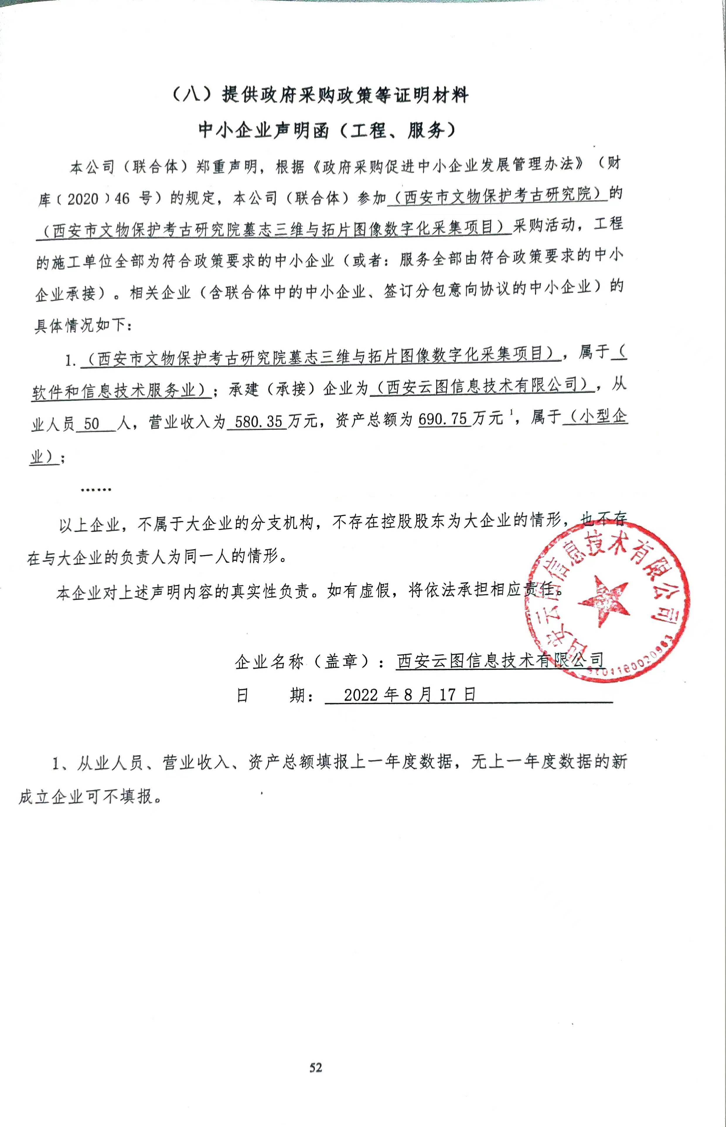 自本公告发布之日起1个工作日。 八、其他补充事宜本项目成交单位承诺为小型企业,特此公示,接受社会监督。 九、凡对本次公告内容提出询问,请按以下方式联系。 1.采购人信息名称:西安市文物保护考古研究院 地址:西安市碑林区友谊西路68号 联系方式:张老师、029-85258795 2.采购代理机构信息名称:陕西笃信招标有限公司 地址:陕西省西安市经济技术开发区凤城十一路与文景路十字西北角文景商务广场B座8层 联系方式:029-86253389 3.项目联系方式项目联系人:黄安舒、李纪旋 电话:029-86253389 陕西笃信招标有限公司 2022年08月18日 相关附件: 西安市文物保护考古研究院墓志三维与拓片图像数字化采集中标(成交)明细.pdf 中小企业声明函.jpg 最后磋商报价表.jpg 193西安市文物保护考古研究院墓志三维与拓片图像数字化采集项目(定稿).docx 十一、其他事项: ------------------------------------招标信息结束---------------------------- 标签: 西安市 拓片 墓志 研究院 图像 公告 上一篇: 2022年8月18日安义县利邦绿色农业有限公司2022年南昌市现代农业产业园安义县瓦灰鸡产业园采购项目中标公告 最新5000条招标信息列表: 滚动招标 |