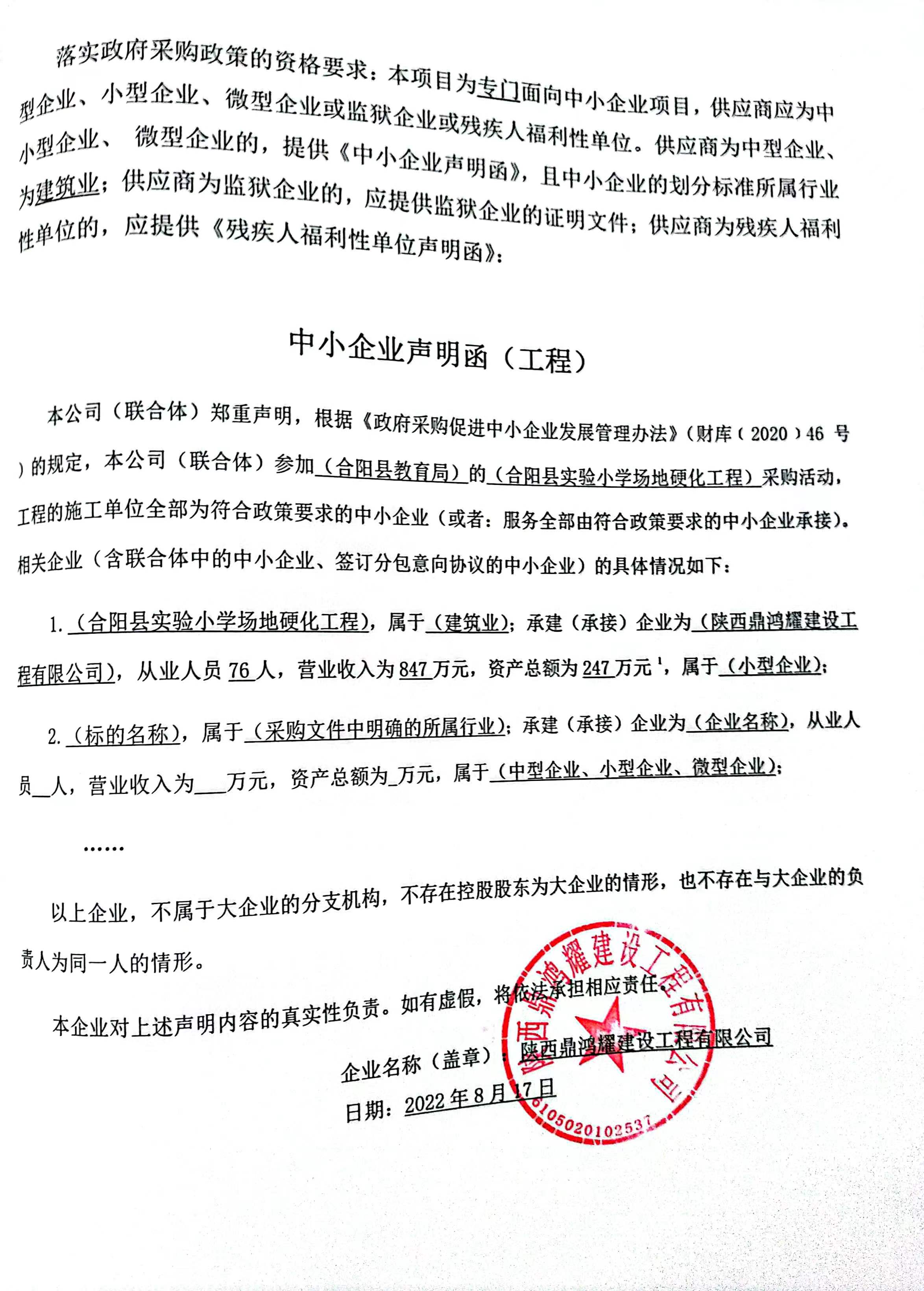 合同包1(合阳县实验小学场地硬化工程): 工程类(陕西鼎鸿耀建设工程有限公司)