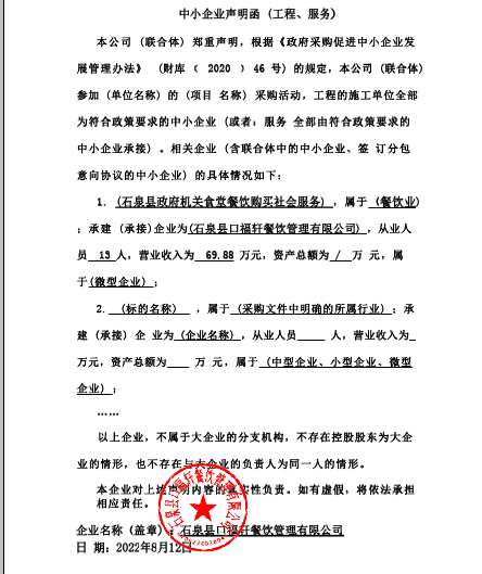自本公告发布之日起1个工作日。 八、其他补充事宜无 九、凡对本次公告内容提出询问,请按以下方式联系。 1.采购人信息名称:石泉县人民政府办公室 地址:石泉县人民路1号 联系方式:0915-6313609 2.采购代理机构信息名称:陕西华泰工程项目管理有限公司 地址:陕西省西安市经开区凤城五路世融嘉轩5号楼27层 联系方式:029-86250354 3.项目联系方式项目联系人:杨工、张工 电话:029-86250354 陕西华泰工程项目管理有限公司 2022年08月19日 相关附件: 中小企业声明.jpg 石泉县人民政府办公室石泉县政府机关食堂餐饮购买社会服务中标(成交)明细.pdf 项目报价表.jpg 石泉县政府机关食堂餐饮购买社会服务-竞争性磋商文件.pdf 十一、其他事项: ------------------------------------招标信息结束---------------------------- 标签: 石泉县 政府机关 社会服务 食堂 餐饮 公告 政府办公室 上一篇: 2022年8月19日永清县2022年义务教育薄弱环节改善与能力提升设备购置项目中标公告 最新5000条招标信息列表: 滚动招标 |