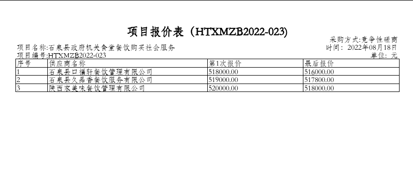 ----------------------------------招标机构发布信息原文:----------------------- <meta http-equiv="content-type" content="text/html;charset=utf-8"> 一、项目编号:HTXMZB2022-023 二、项目名称:石泉县政府机关食堂餐饮购买社会服务 三、采购结果 合同包1(石泉县政府机关食堂餐饮购买社会服务):