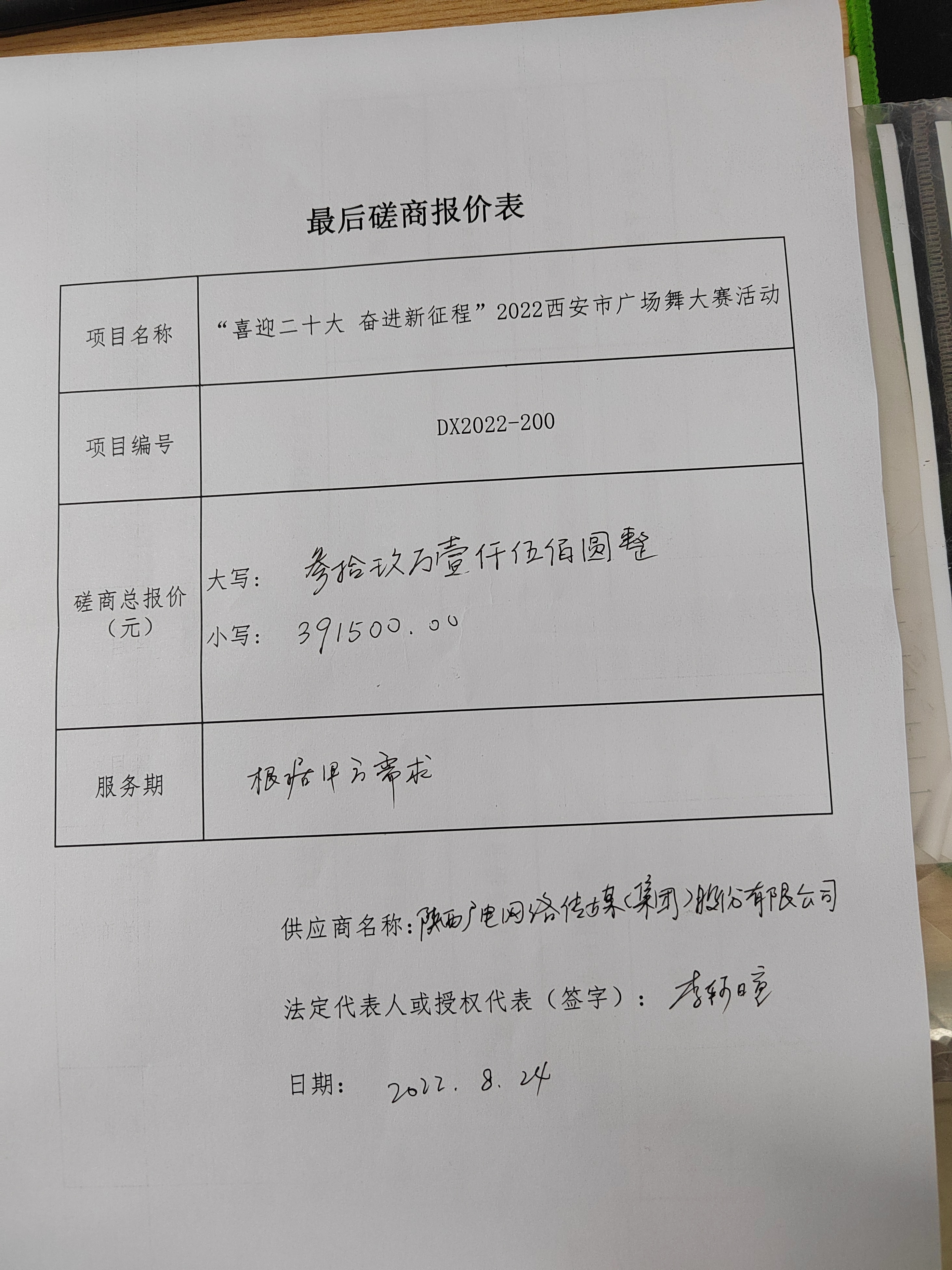 自本公告发布之日起1个工作日。 八、其他补充事宜/ 九、凡对本次公告内容提出询问,请按以下方式联系。 1.采购人信息名称:西安市文化和旅游局(本级) 地址:西安市凤城八路109号 联系方式:王老师029-86788107 2.采购代理机构信息名称:陕西笃信招标有限公司 地址:西安经济技术开发区凤城十一路与文景路十字文景商务广场B座8层 联系方式:029-86253389 3.项目联系方式项目联系人:郭晨、李纪旋 电话:029-86253389 陕西笃信招标有限公司 2022年08月25日 相关附件: 西安市文化和旅游局(本级)“喜迎二十大奋进新征程”2022西安市广场舞大赛活动中标(成交)明细.pdf 广电最终报价表.jpg 十一、其他事项: ------------------------------------招标信息结束---------------------------- 标签: 西安市 二十 大赛 广场 公告 新征程 上一篇: 2022年8月25日梅江河(三龙水电站至梅长大桥段)河道保洁项目(2022年-2025年)结果公告 最新5000条招标信息列表: 滚动招标 |