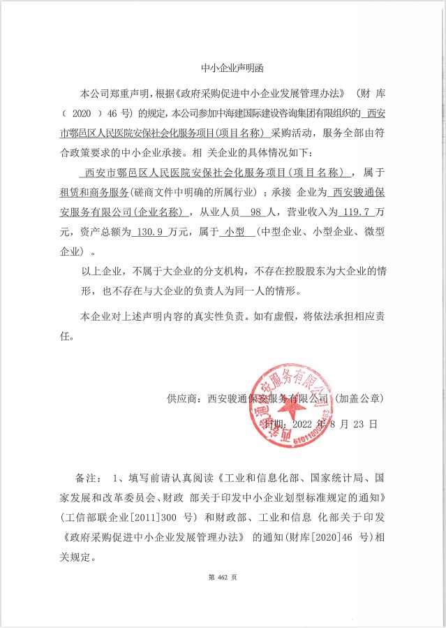 自本公告发布之日起1个工作日。 八、其他补充事宜无 九、凡对本次公告内容提出询问,请按以下方式联系。 1.采购人信息名称:西安市鄠邑区人民医院 地址:鄠邑区渼陂西路5号 联系方式:029-84812533 2.采购代理机构信息名称:中海建国际建设咨询集团有限责任公司 地址:西安市雁塔区南二环西段154号易和蓝钻23楼西 联系方式:029-88852536 3.项目联系方式项目联系人:李静、邓敏 电话:029-88852536-6009 中海建国际建设咨询集团有限责任公司 2022年08月25日 相关附件: 中小企业声明函1.jpg 中小企业声明函2.jpg 西安市鄠邑区人民医院安保社会化服务项目中标(成交)明细.pdf 十一、其他事项: ------------------------------------招标信息结束---------------------------- 标签: 中标 西安市 安保 服务项目 人民医院 公告 鄠邑区 上一篇: 2022年8月25日桦南县第一中学电子白板采购项目结果公告 最新5000条招标信息列表: 滚动招标 |