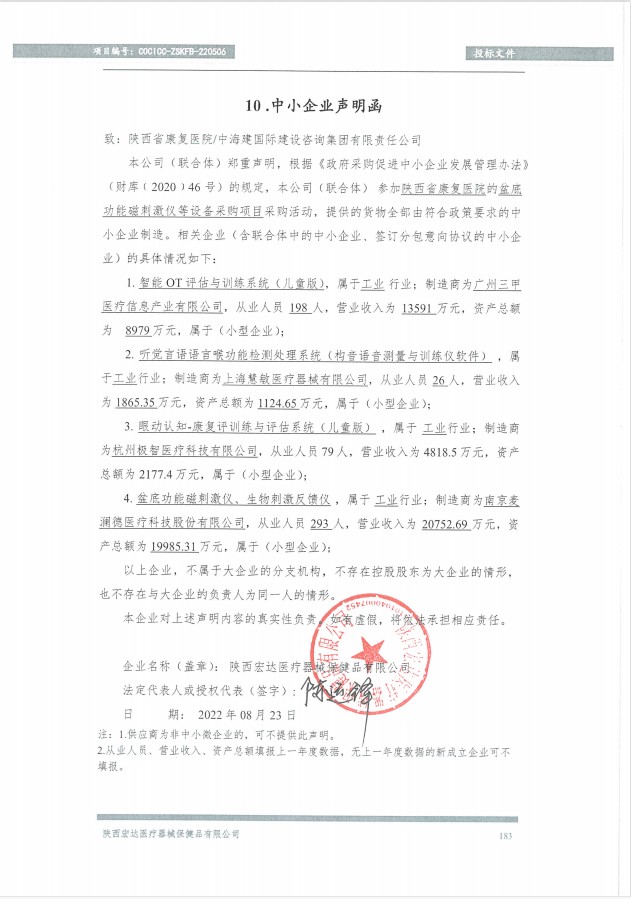 自本公告发布之日起1个工作日。 八、其他补充事宜无 九、凡对本次公告内容提出询问,请按以下方式联系。 1.采购人信息名称:陕西省康复医院 地址:西安市电子二路52号 联系方式:89288722 2.采购代理机构信息名称:中海建国际建设咨询集团有限责任公司 地址:西安市雁塔区南二环西段154号易和蓝钻23楼西 联系方式:029-88852536 3.项目联系方式项目联系人:李静、邓敏 电话:029-88852536-6009 中海建国际建设咨询集团有限责任公司 2022年08月29日 相关附件: 中小企业声明函.jpg 陕西省康复医院盆底功能磁刺激仪等设备采购项目中标(成交)明细.pdf 十一、其他事项: ------------------------------------招标信息结束---------------------------- 标签: 项目 中标 医院 陕西省 设备采购 功能 公告 上一篇: 2022年8月29日购置水车项目(四次)公开招标中标公告 最新5000条招标信息列表: 滚动招标 |