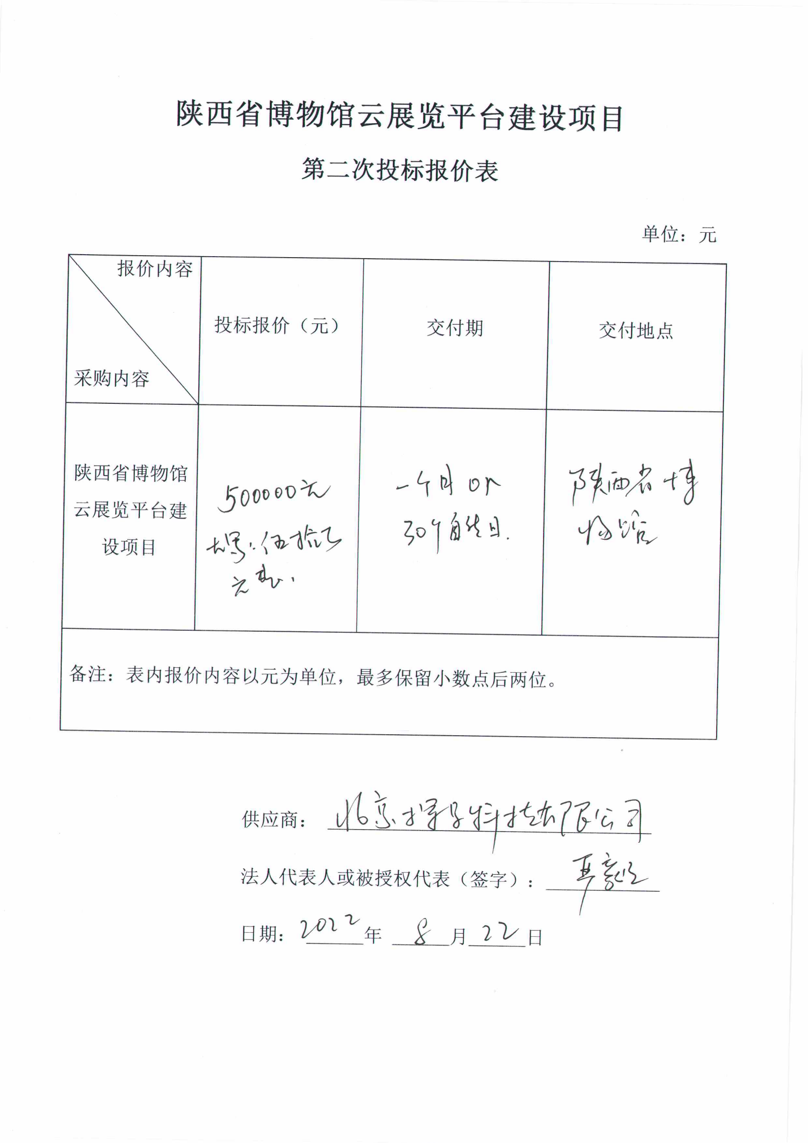 自本公告发布之日起1个工作日。 八、其他补充事宜1、交付期:30个日历日(具体起止日期可随合同签订时间相应顺延) 2、交付地点:陕西历史博物馆 九、凡对本次公告内容提出询问,请按以下方式联系。 1.采购人信息名称:陕西历史博物馆 地址:西安市雁塔区小寨东路91号 联系方式:62739017 2.采购代理机构信息名称:陕西博之众招标代理有限公司 地址:陕西省西安市莲湖区陕西省西安市莲湖区西关街道丰庆路39号御溪望城5号楼4楼410室 联系方式:029-89588800 3.项目联系方式项目联系人:党碧影 电话:029-89588800 陕西博之众招标代理有限公司 2022年08月29日 相关附件: 陕西历史博物馆陕西省博物馆云展览平台建设项目中标(成交)明细.pdf 020二次报价表.png 十一、其他事项: ------------------------------------招标信息结束---------------------------- 标签: 中标 陕西 历史博物馆 陕西省 建设项目 博物馆 公告 上一篇: 2022年8月29日莘县一中教育集团新城高级中学教育装备采购项目中标(成交)公告 最新5000条招标信息列表: 滚动招标 |