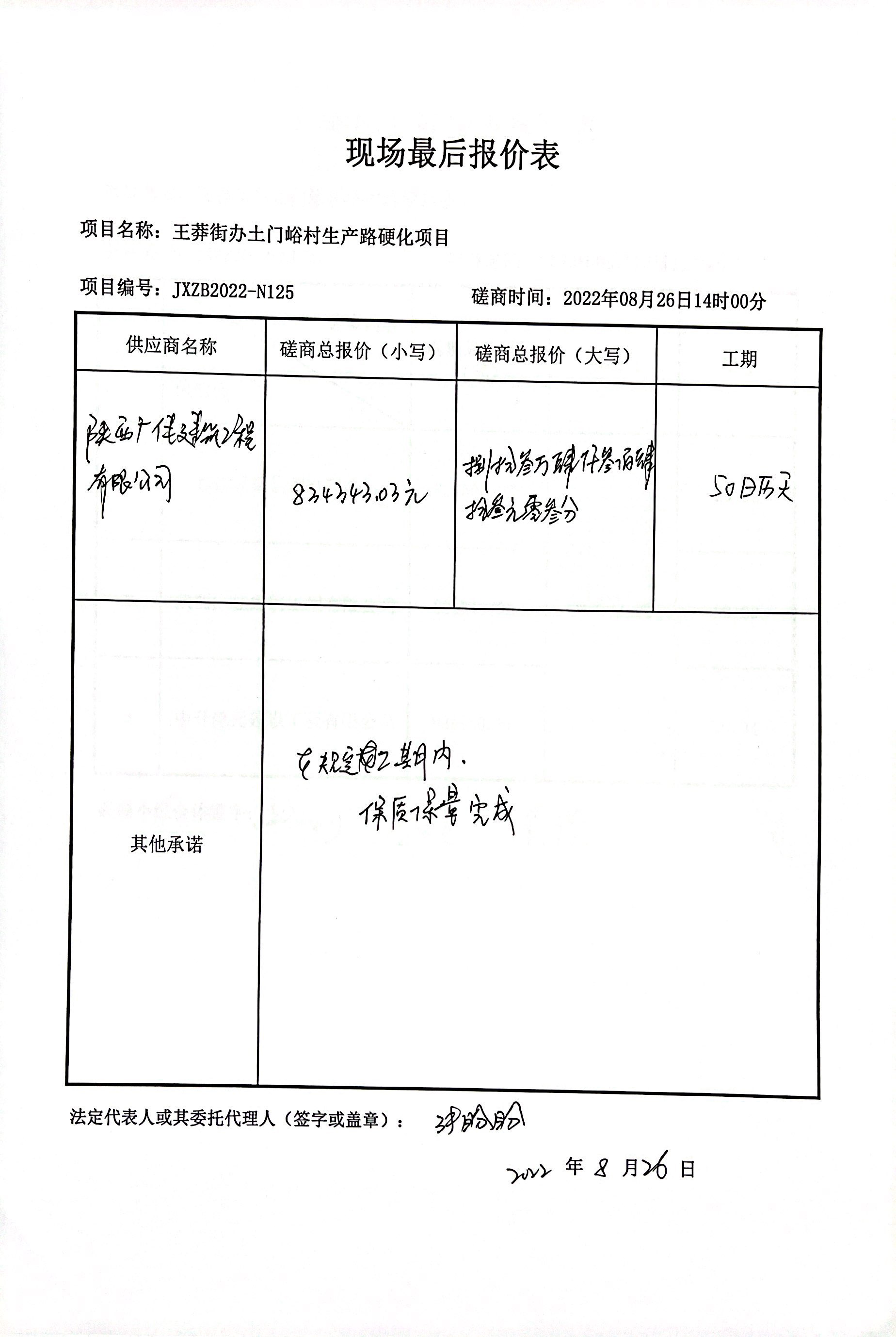 合同包1(王莽街道土门峪村生产路硬化项目): 工程类(陕西广佳建筑工程有限公司)