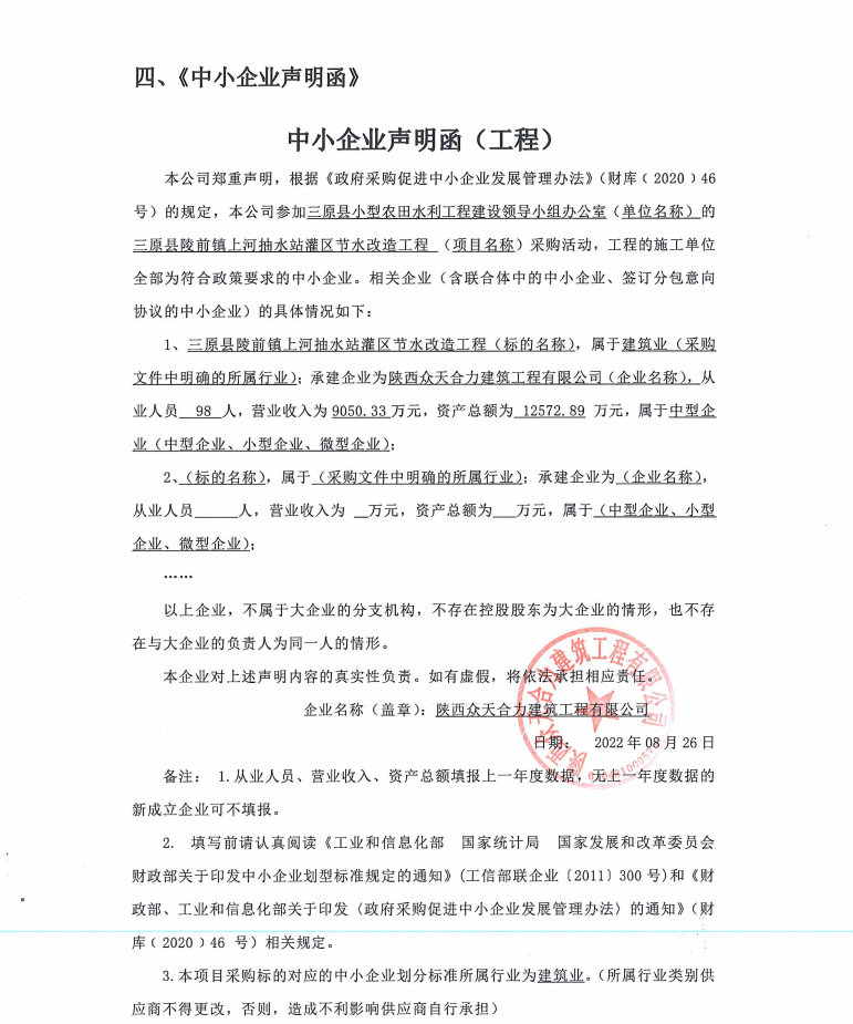 合同包1(三原县陵前镇上河抽水站灌区节水改造工程): 工程类(陕西众天合力建筑工程有限公司)